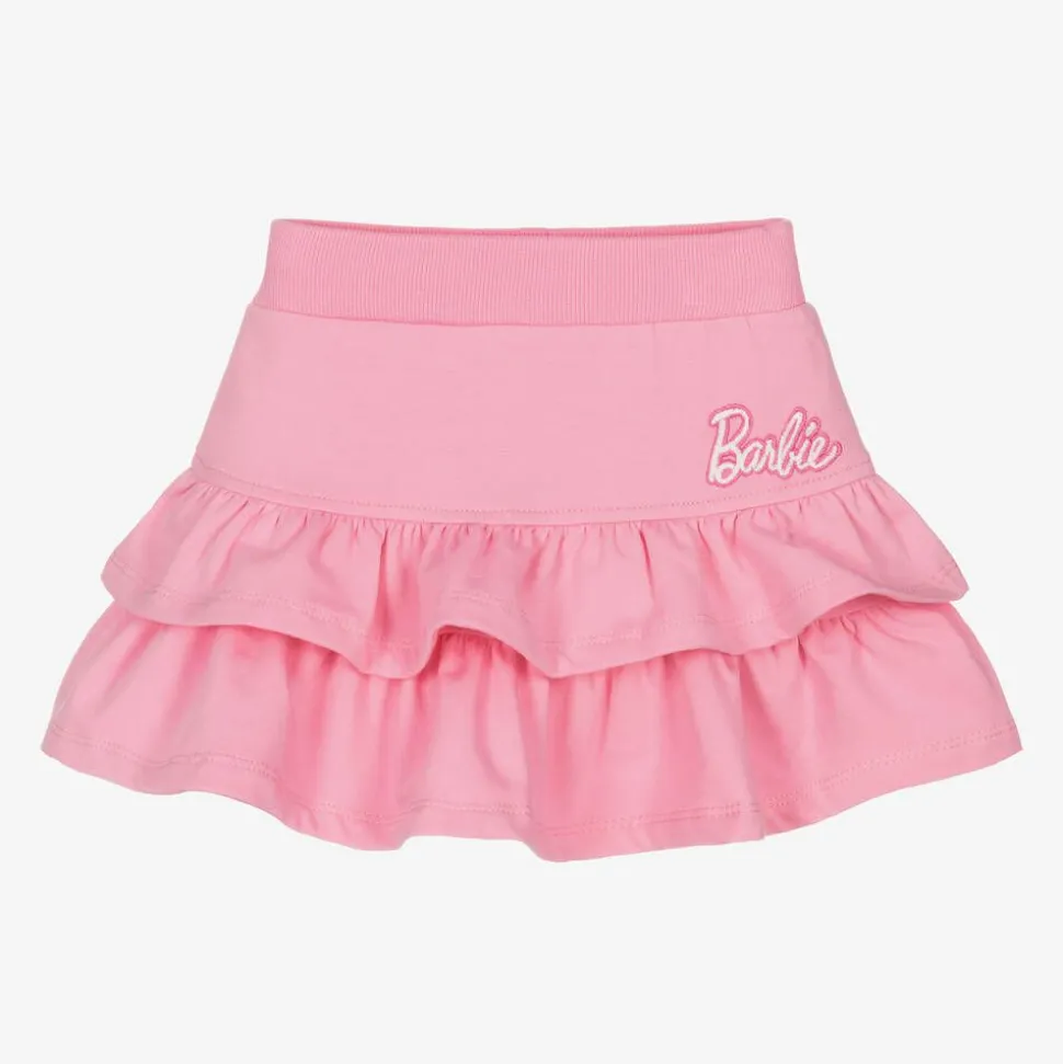 From Monnalisa, a pink cotton skirt for girls with a Barbie logo embroidered on the front. With an elasticated waist for comfort, this jersey skirt has ruffles to create a lovely shape.