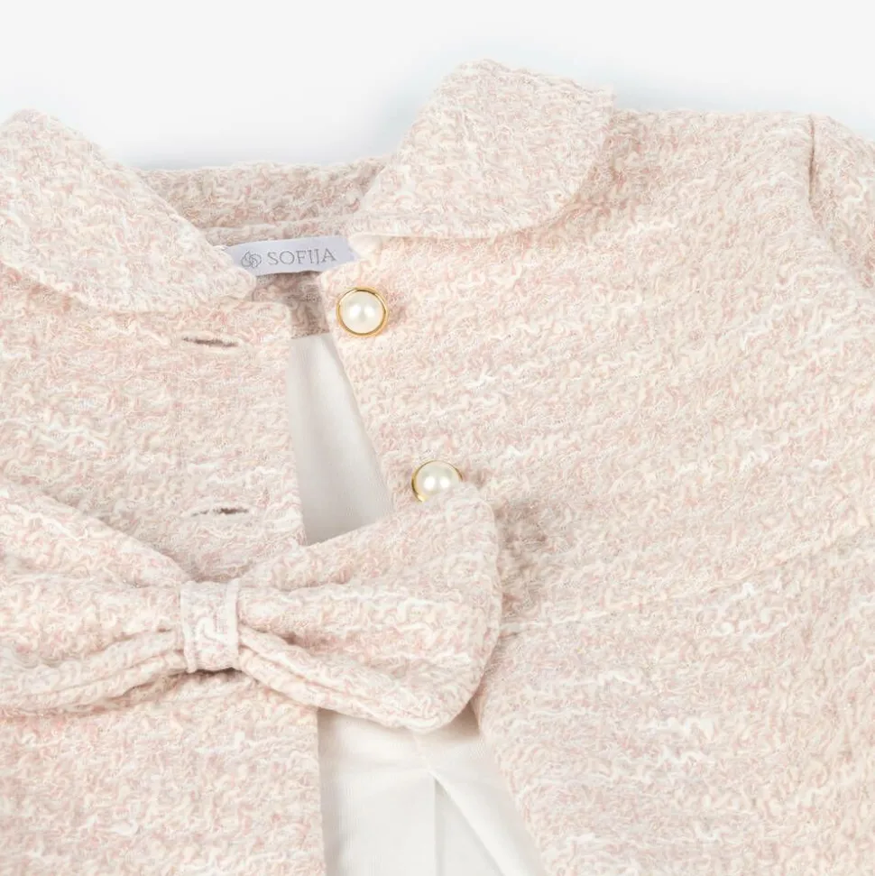 A traditional pale pink coat for younger girls by Sofija, made in tweed-effect cotton with a lovely soft feel. Woven with a glittery gold thread for a subtle shimmer, this classic piece is lined in cotton jersey for comfort. It fastens with faux pearl buttons and has a decorative bow on the front for a pretty finish.
