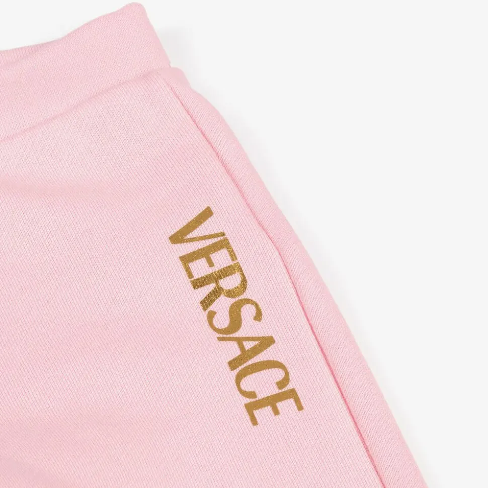 Soft and comfortable pink cotton joggers for little girls from luxury brand Versace. Made in mid-weight jersey with an elasticated waist, these flared joggers have a metallic gold logo on the leg for a touch of sparkle.