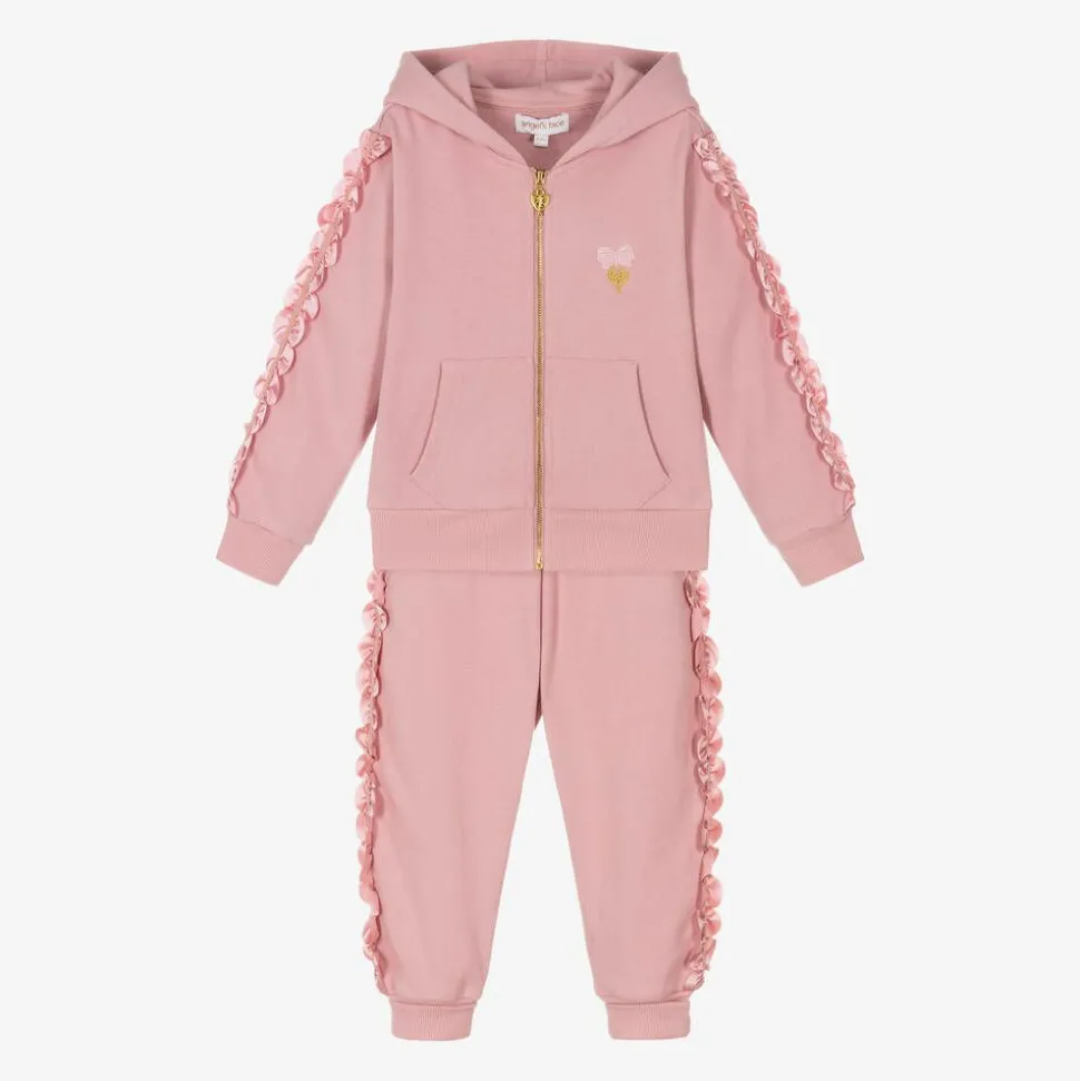 Pink tracksuit for girls by Angel's Face, made in soft and comfortable cotton jersey. Fastening with a branded gold-tone zip, the hooded top has the brand's signature golden heart and bow appliqué on the chest, and a useful pouch pocket. The cuffed joggers have slanted front pockets and an adjustable, elasticated waistband. Both pieces have decorative satin trims for a pretty finish.
