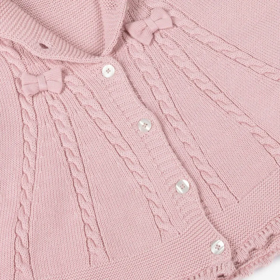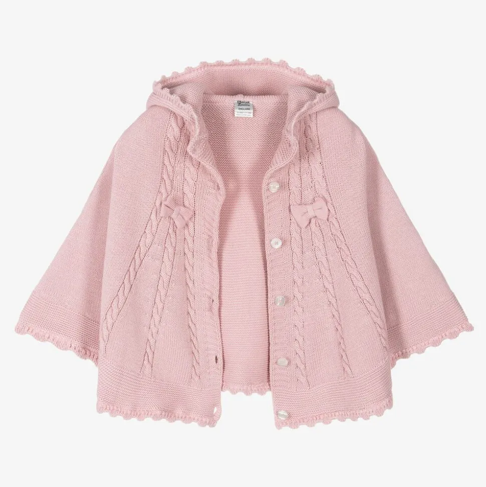 Cosy and warm for little girls, a delightful pink cape by Sarah Louise. Made in a double-layered soft cotton knit, it has classic cable stitch detailing and pretty decorative bows. There is a cosy hood, button fastenings down the front, and poppers to create arm holes.