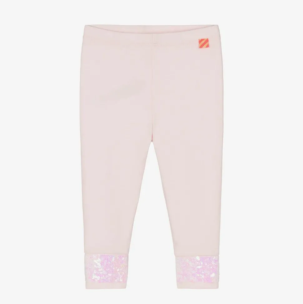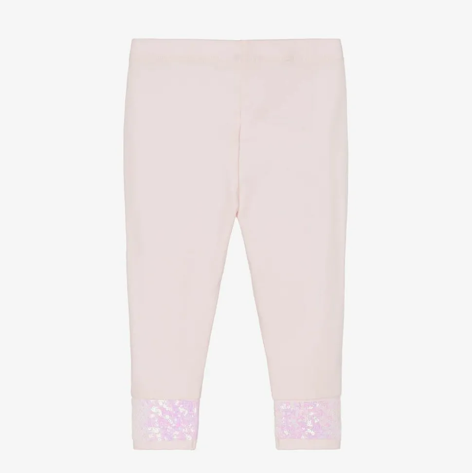 Pale pink long leggings for little girls by Billiblush, made in soft cotton-blend jersey. The cuffs are trimmed with sequins for a sparkly finish and there is an elasticated waistband for a comfortable fit.