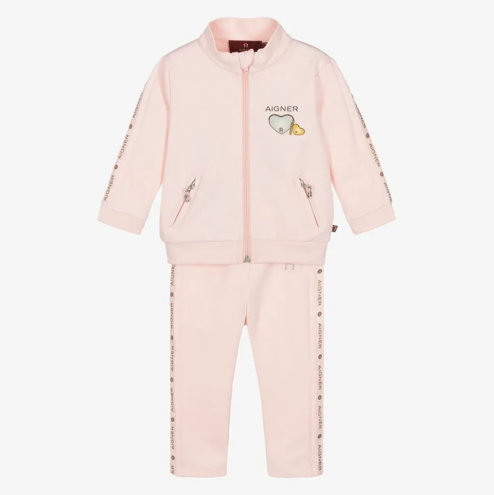 Lovely pink cotton tracksuit for little girls by AIGNER, made in soft and lightweight sweatshirt jersey. The turtle-neck top has a zip fastening with a protective chin guard and secure zipped pockets with branded silver-tone pulls. The straight-leg joggers have a gently elasticated waistband for comfortable, easy pull-on. The top is detailed with a sweet glittery gold and silver heart logo print on the chest and the joggers have a sparkly diamanté 'A' horseshoe logo on the hip. Completing the look with designer style, both pieces have sheer organza trims with a repeat gold logo print.
