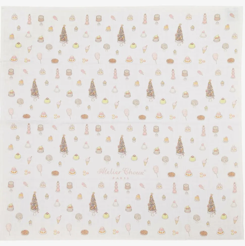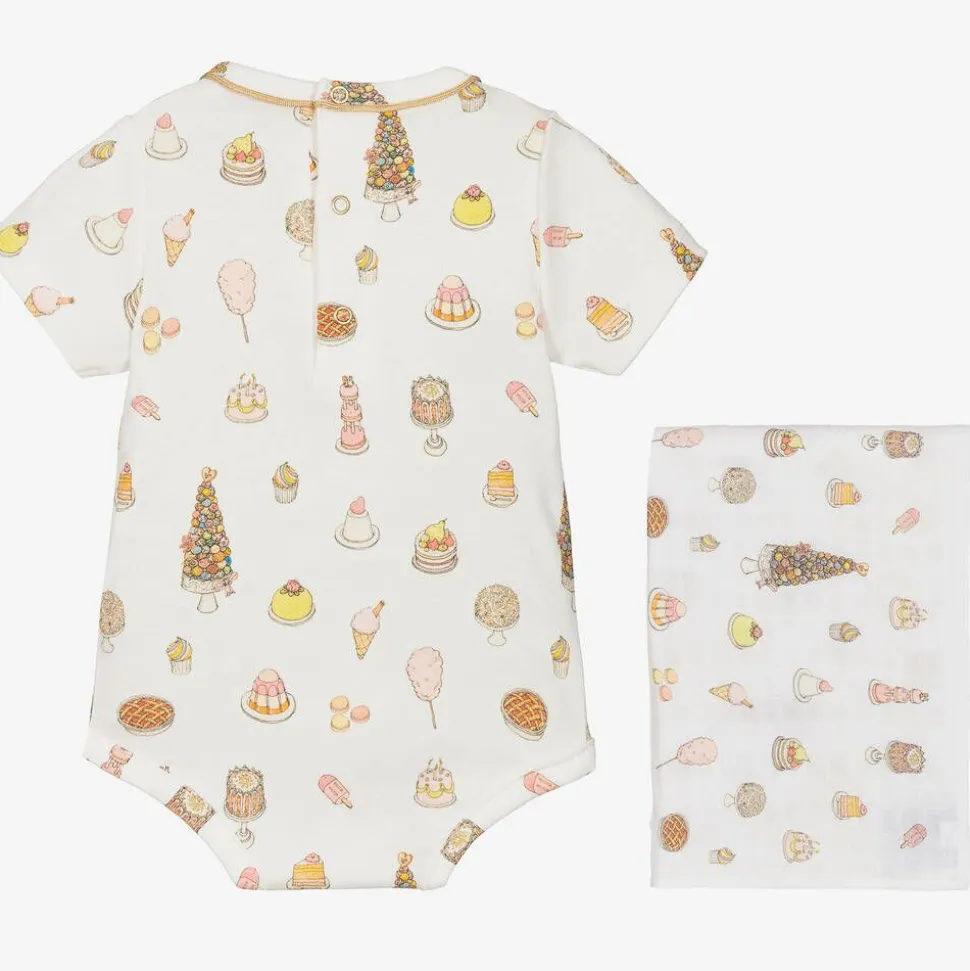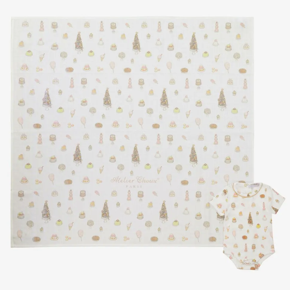 Ivory and pink babysuit set for girls by luxury French designer Atelier Choux Paris. A charming gift for newborns, both items are patterned in colourful and traditional sweet treats. The delicate cotton jersey bodyvest has a gold trim around the neckline and popper fastenings between the legs. An organic cotton swaddle is included, which is lovely for use as a breathable blanket or for privacy whilst breastfeeding.