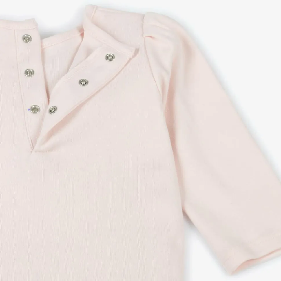 Pale pink top for little girls by Carrément Beau, made in soft cotton jersey for comfortable wear. This cute piece has long puffed sleeves and a simple round neckline. Disney's beloved Bambi is printed on the front, running through beautiful blue and pink flowers with glittery details. Poppers fasten easily on the back.