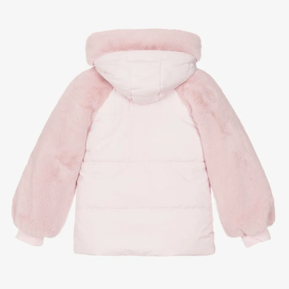 Lovely pink hooded jacket for girls by Lapin House. The smooth puffer style body is lightly padded and has pockets on the front. The sleeves and edge of the hood are made in super soft faux fur for added cosiness. Lined in soft cotton, this lovely jacket has an internal drawstring waist, a zip fastening on the front and a useful chin guard.