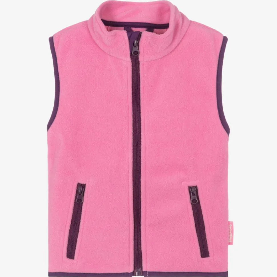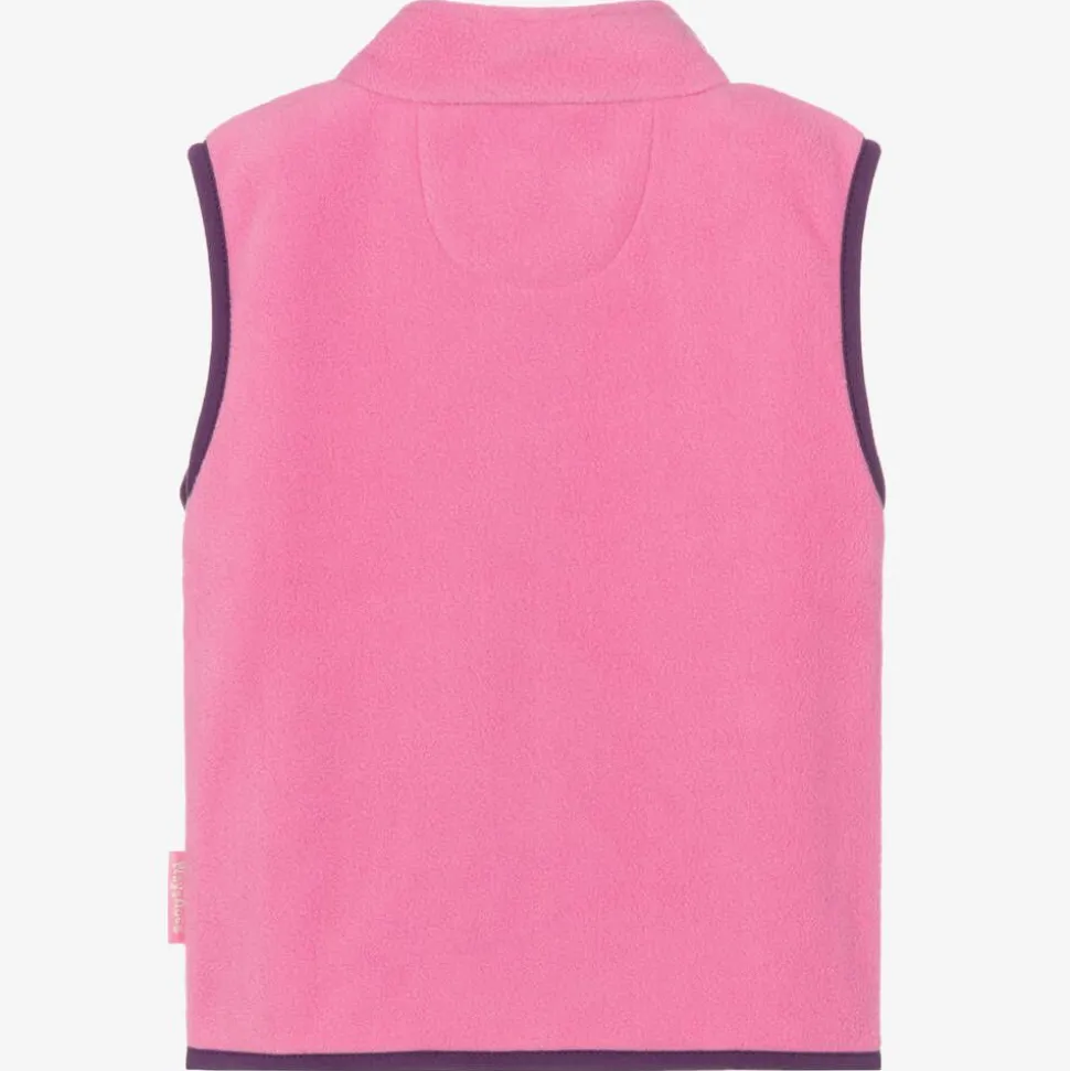 Pink gilet for girls from Playshoes, made from soft fleece with purple trims. It has a high neck, a chin guard on the top of the zipper and two useful zipped pockets. Practical and versatile for everyday, it also makes a cosy layering piece when the season changes.