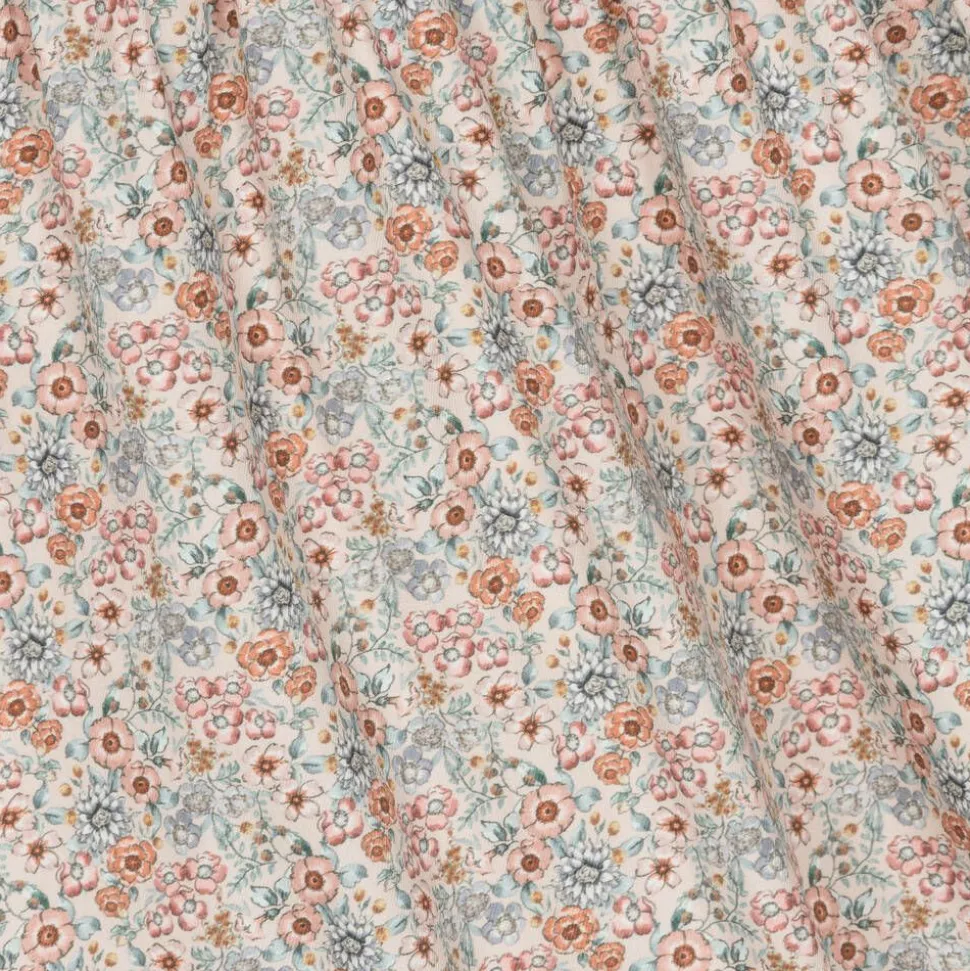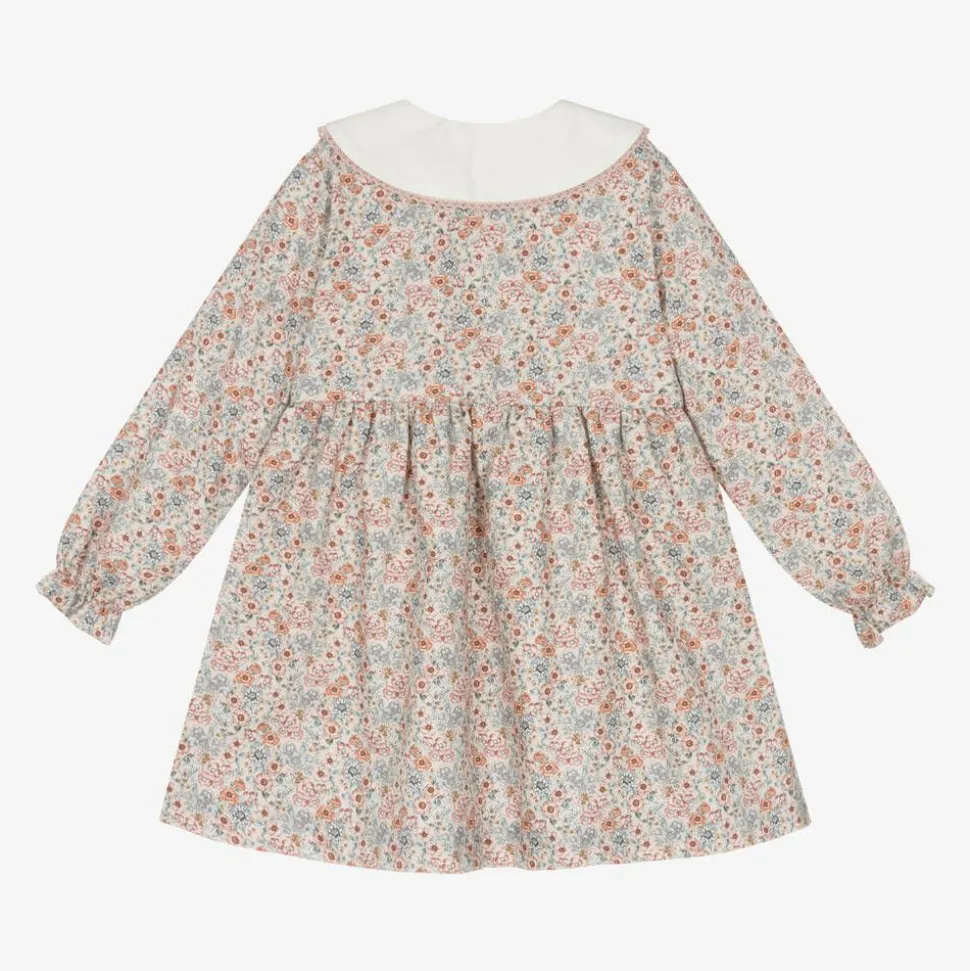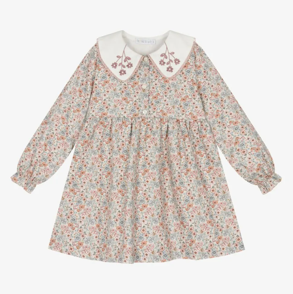 Exclusive to Childrensalon, a dusky pink dress for girls by Spanish brand Paloma de la O. It is made in soft cotton twill and patterned in a pretty floral print in pink and blue. It has a contrasting white collar, trimmed in delicate lace and decorated with beautiful floral embroidery. Lined in lightweight voile for comfort, this traditional style has frilly cuffs on the long sleeves and fastens with pearlescent buttons on the front.