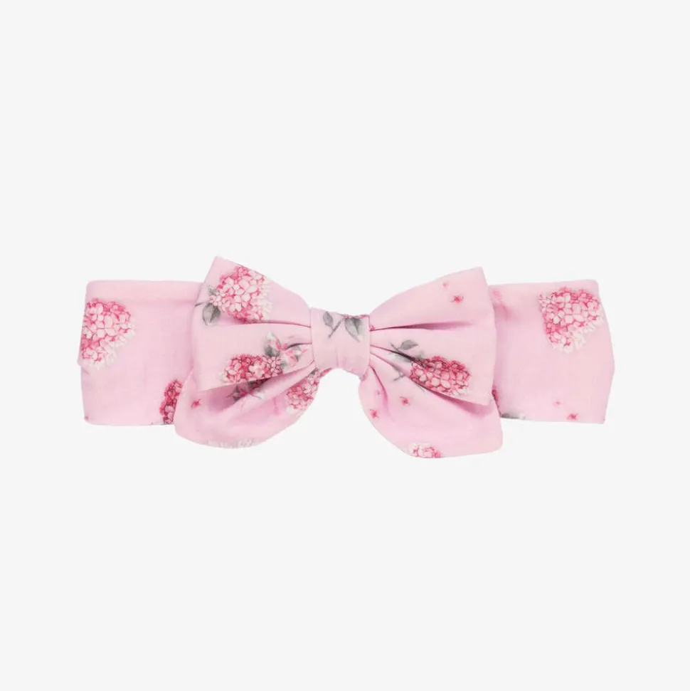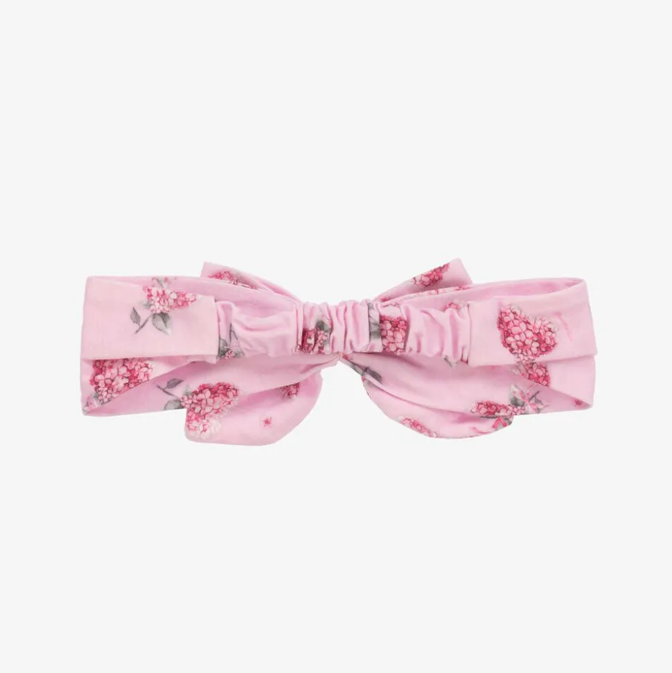 A pretty pink headband for little girls by Monnalisa, made from soft cotton jersey. Printed with a charming floral pattern, it has a statement bow decoration for a sweet look. There is an elasticated panel at the back to ensure a comfortable fit.
