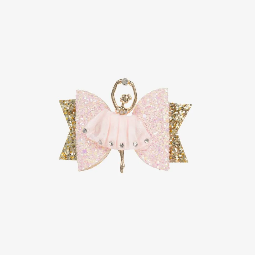 Pretty pink and gold bow hair clip for girls by Bowtique London. Handmade in iridescent and gold glitter covered fabric, it has a lovely ballerina figure, with a sparkly diamanté tutu skirt and sets on a metal clip.