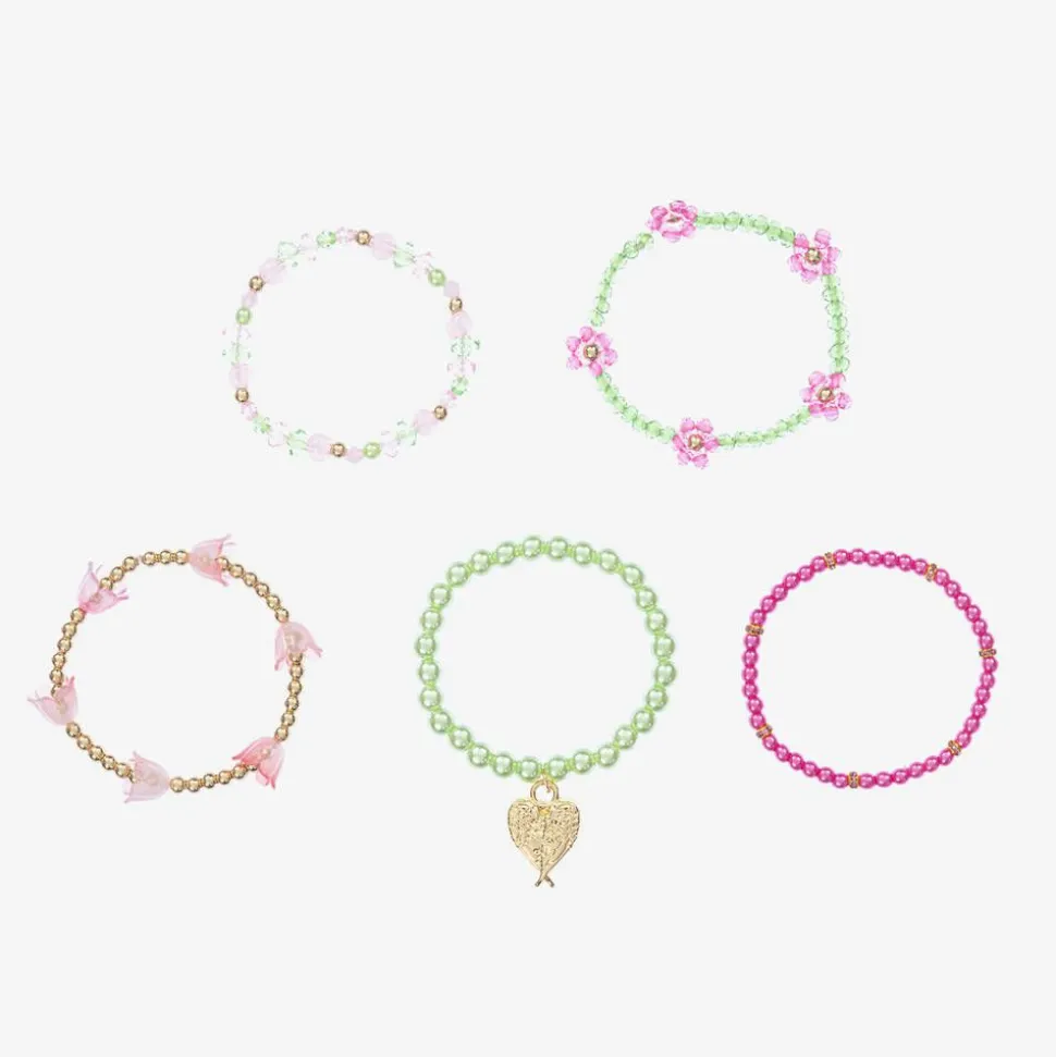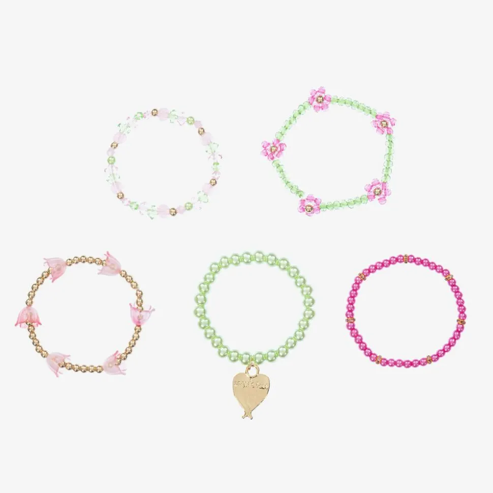 A lovely pack of five beaded bracelets for girls by Angel's Face in delightful shades of pink, green, and gold. With elasticated strings for a comfortable fit and easy wear, each one has a unique design featuring faux pearls, sparkly diamantés, pretty flowers, and the signature heart charm.