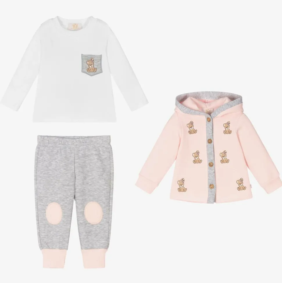 Cute pink and grey tracksuit set for little girls from Caramelo Kids, made in soft and comfortable jersey. The white top has long sleeves and a grey chest pocket appliqué with a sweet embroidered teddy bear. The button-fastening hooded top has matching embroidered bears on the front and the joggers have contrast cuffs and knee patches.