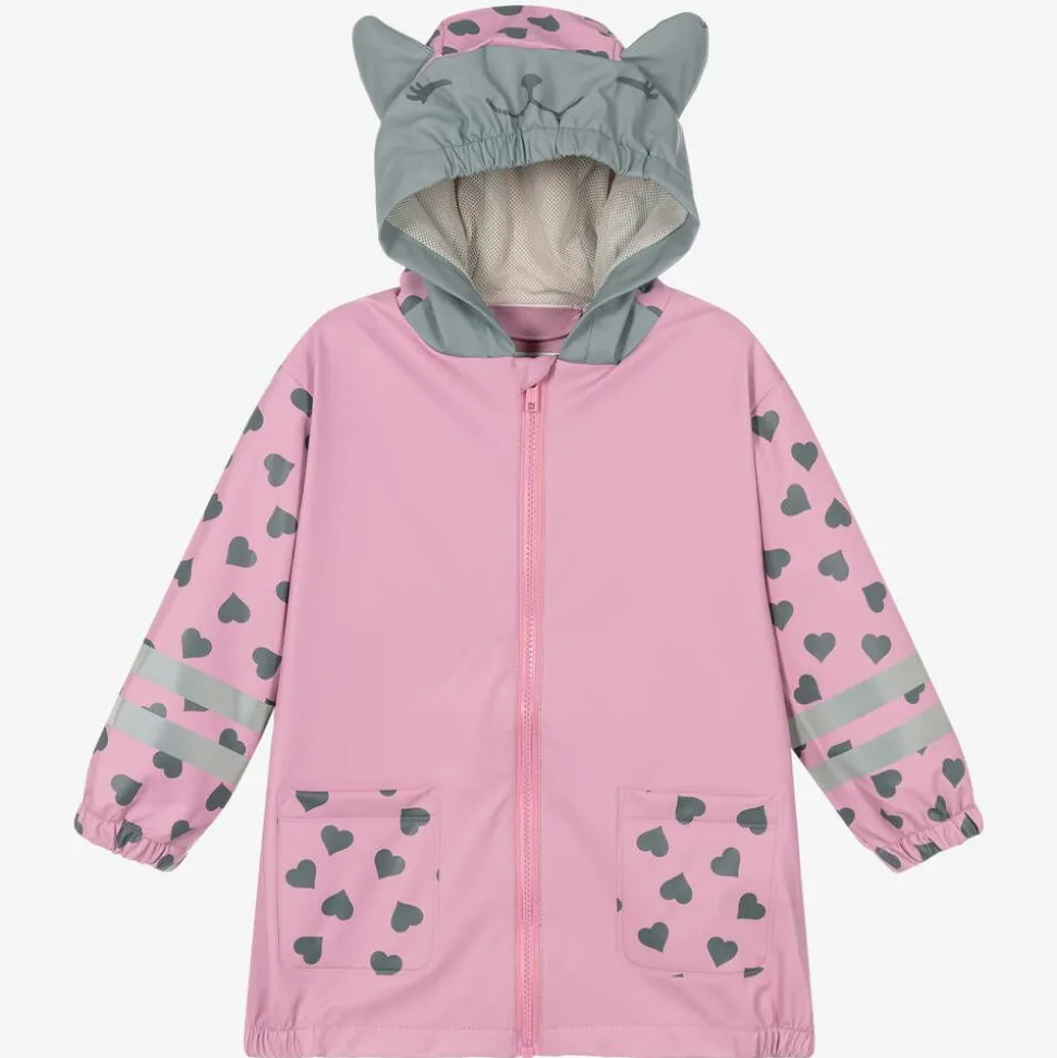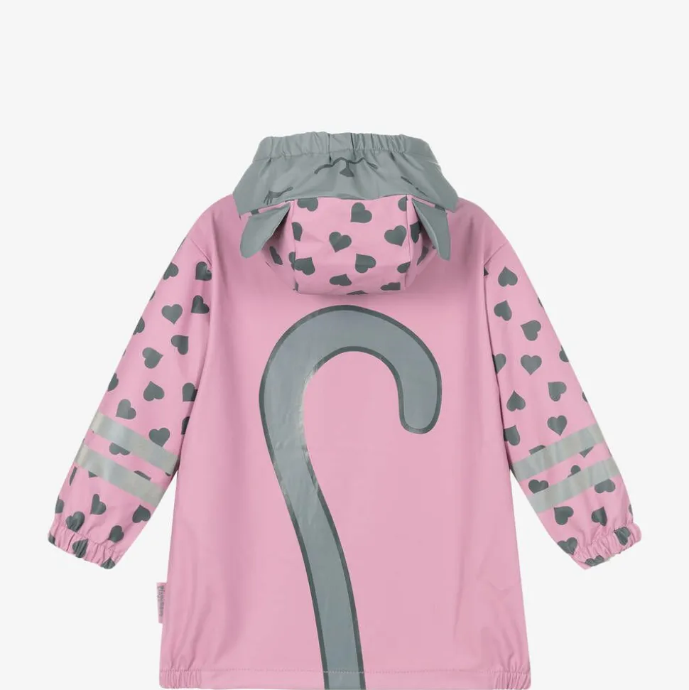 Girls pink hooded zip-up raincoat by Playshoes, with grey heart prints. The fixed, mesh-lined hood has a grey trim with cute padded ears and an animal face print on the front. Waterproof and lightweight, it has light reflective stripes on the sleeves for better visibility and elasticated panels on the cuffs and hem to keep the cold out. There are two pockets on the front and a playful grey tail print on the back.