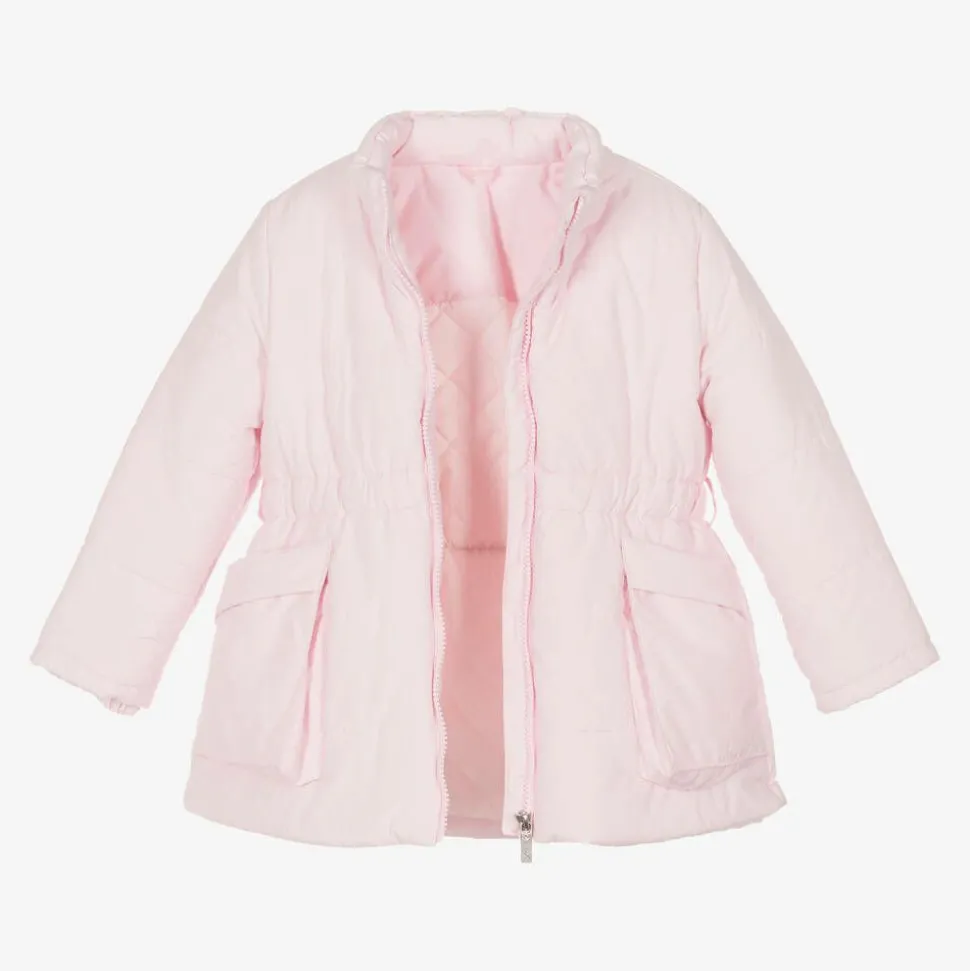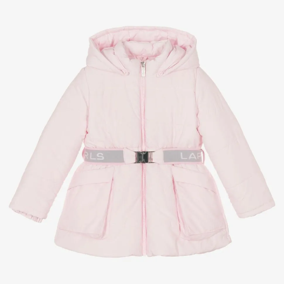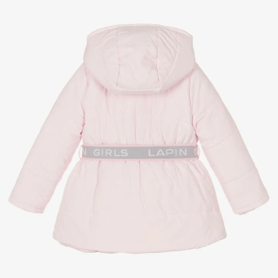 Pale pink puffer coat for girls by Lapin House, with cosy, mid-weight padding. Beautifully soft and warm, it has a useful, removable hood secured with buttons to keep chilly weather out, along with wrist inserts. For brand recognition, the front zip has a silver diamanté logo pull tab and the detachable, elasticated belt has repeat jacquard logos. The coat has front pockets and a quilted lining for comfort.