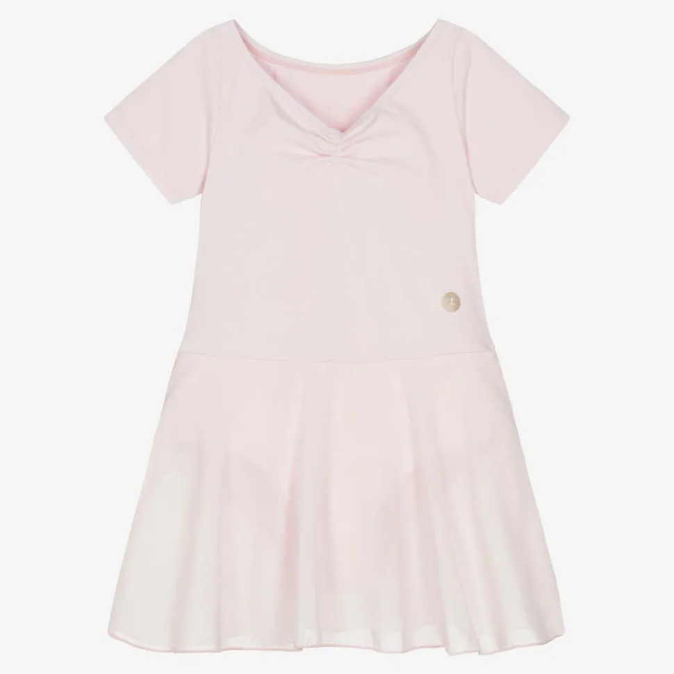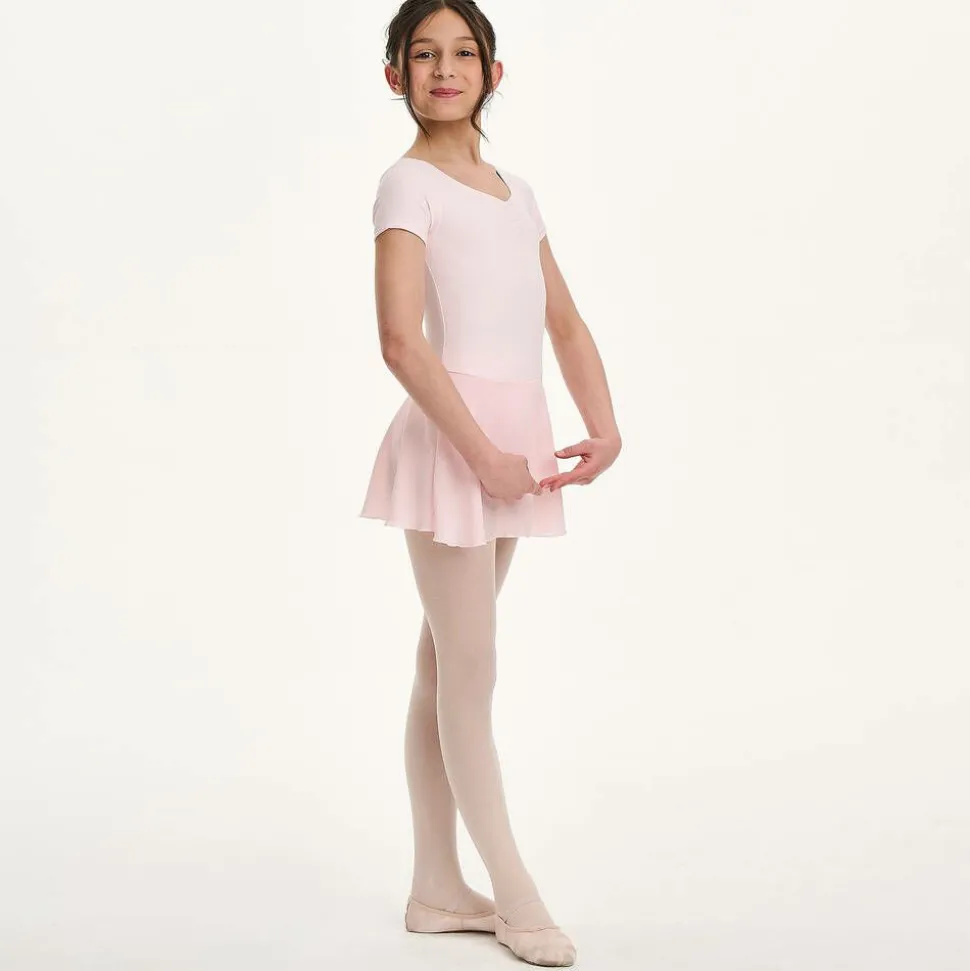 Pretty pale pink leotard dress for girls by dancewear brand, Danskin. Made using the designer's super soft four-way stretch fabric for free movement, the leotard body has a ruched centre and short sleeves. The sheer skirt is attached to the breathable, fitted leotard and is beautifully floaty for ballet and dance classes. Rose gold logo prints complete the style with a branded touch.