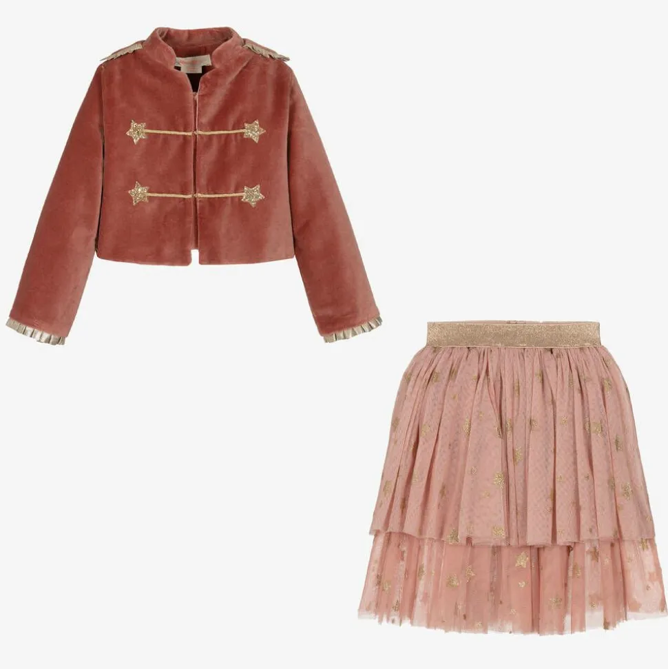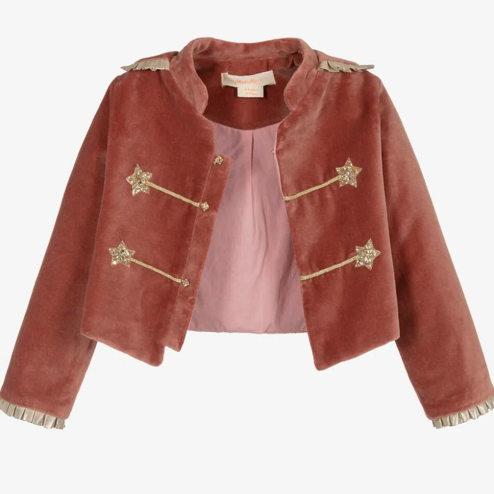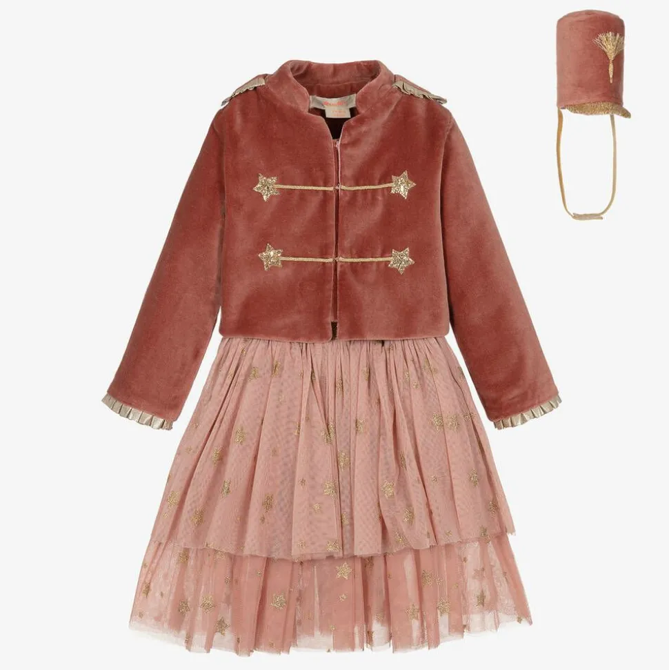 Magically transform into the nutcracker in this pink soldier costume for girls by Meri Meri. Beautifully crafted in velvet, the dusky pink jacket and hat have glittery gold stars and tassels decorated on the front. Fully lined, the jacket fastens with hooks and the hat secures with a stretchy velcro strap. A delicate light pink tulle skirt completes the outfit, featuring a sparkly elasticated waistband and a star pattern.