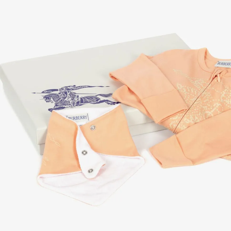 Pale coral pink babysuit set for girls by luxury designer Burberry, made in soft cotton jersey. Fastened with a two-way zip, the babygrow features The Equestrian Knight Design, printed with a dotted effect. It has a zip guard on the chin, fold-over feet and protective scratch mitt cuffs. It can be worn with the matching bandana bib, secured with adjustable poppers on the back. Absorbent towelling on the back panel helps to protect clothes from dribble and spills. This product contains organic cotton and is presented in a branded gift box.