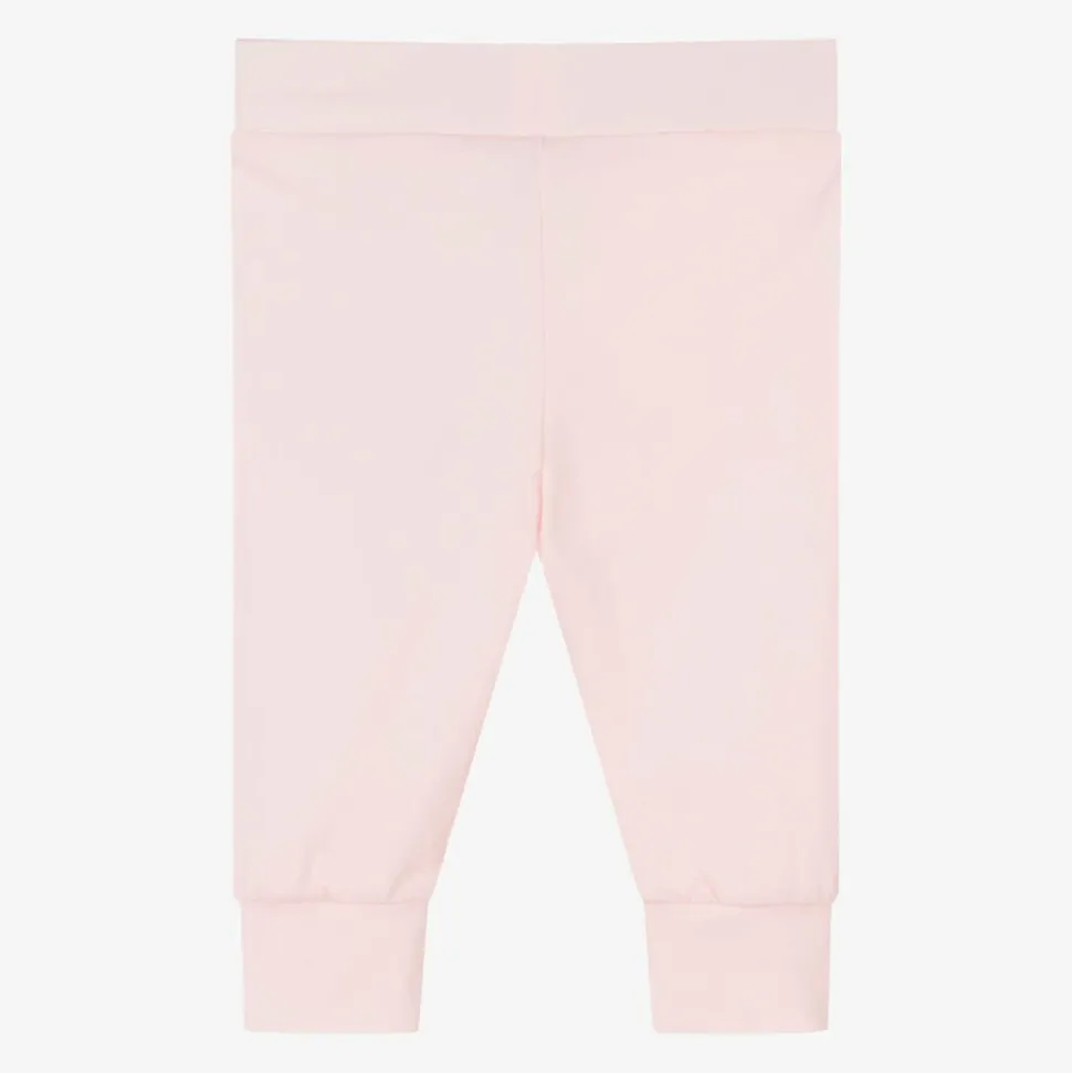 Pale pink full-length leggings for younger girls by BOSS, made from soft and stretchy organic cotton jersey. Casual and comfortable, they have a gently elasticated waistband and lightly ribbed ankle cuffs, one of which features a tonal logo print for a subtle designer touch.