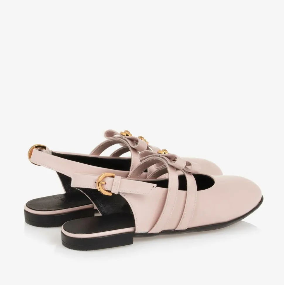 Elegant pumps for girls by luxury fashion designer Versace, in light pink patent leather. With golden hardware, they are enhanced by the Italian label's Medusa motifs on bows across the foot. These chic slingbacks have adjustable buckle fastenings on the back, a comfortable leather lining, and non-slip rubber soles. Hidden elastic on the front and ankle straps ensure they are comfortable.