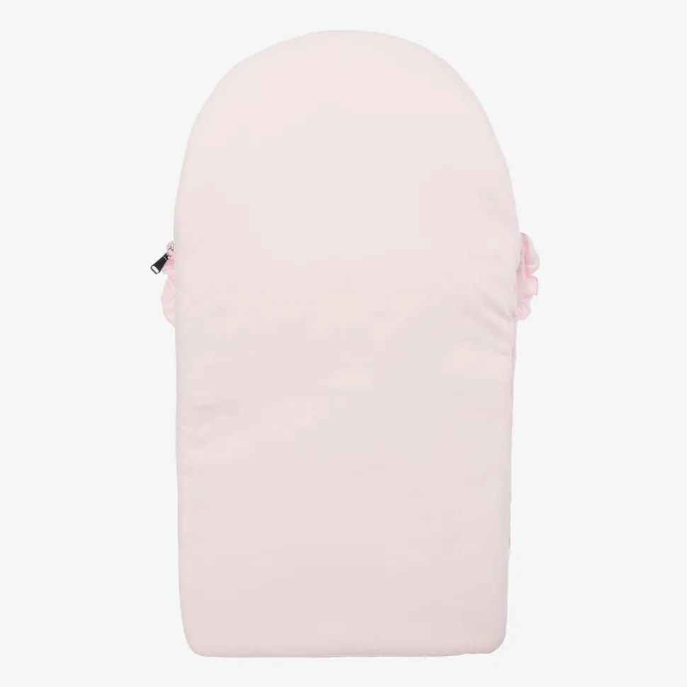 Pink nest for baby girls by AIGNER, made in super soft Pima cotton jersey. Lightly padded for warmth, it has a zip fastening down one side and along the base for easy access and a frilled fold-down front. For a distinctive look, a shimmering metallic gold logo design can be seen on the front incorporating the signature 'A' horseshoe logo.
