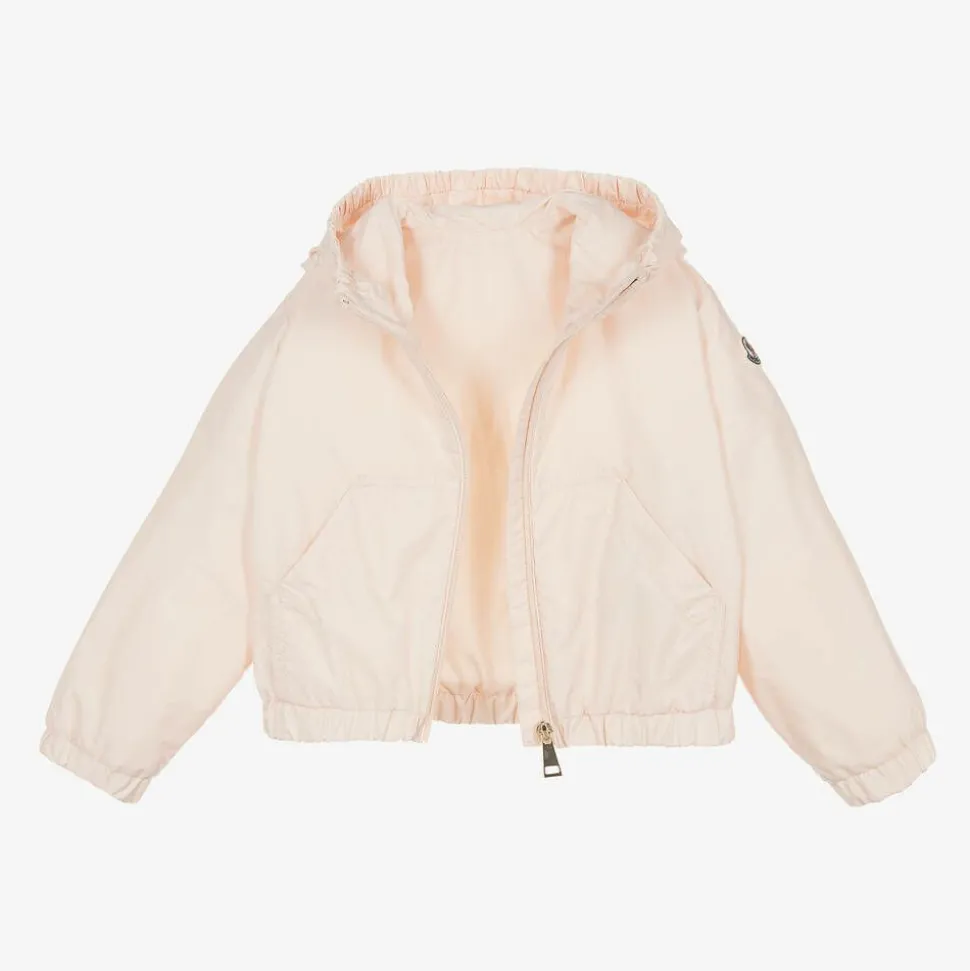 Pale pink windbreaker for girls by luxury brand Moncler Enfant, with a distinctive white mesh logo on the back. Silky smooth and water repellent, it is elasticated around the hood, cuffs and hem to help keep out chilly winds. It fastens with an exposed zip and has useful pouch pockets on the front. For a signature finish, the designer's iconic felt logo patch is appliquéd on one sleeve.