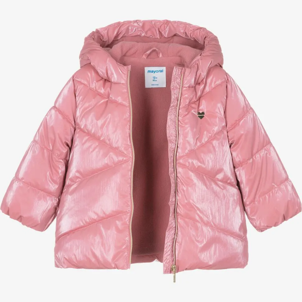 A pink puffer coat for little girls by Mayoral, in a silky smooth, shimmery fabric. This cute coat has a gold zip fastening, a heart-shaped logo charm, and elasticated cuffs. It has a hood and a cosy polar fleece lining to keep your little one warm in colder weather. This product contains recycled fibres.