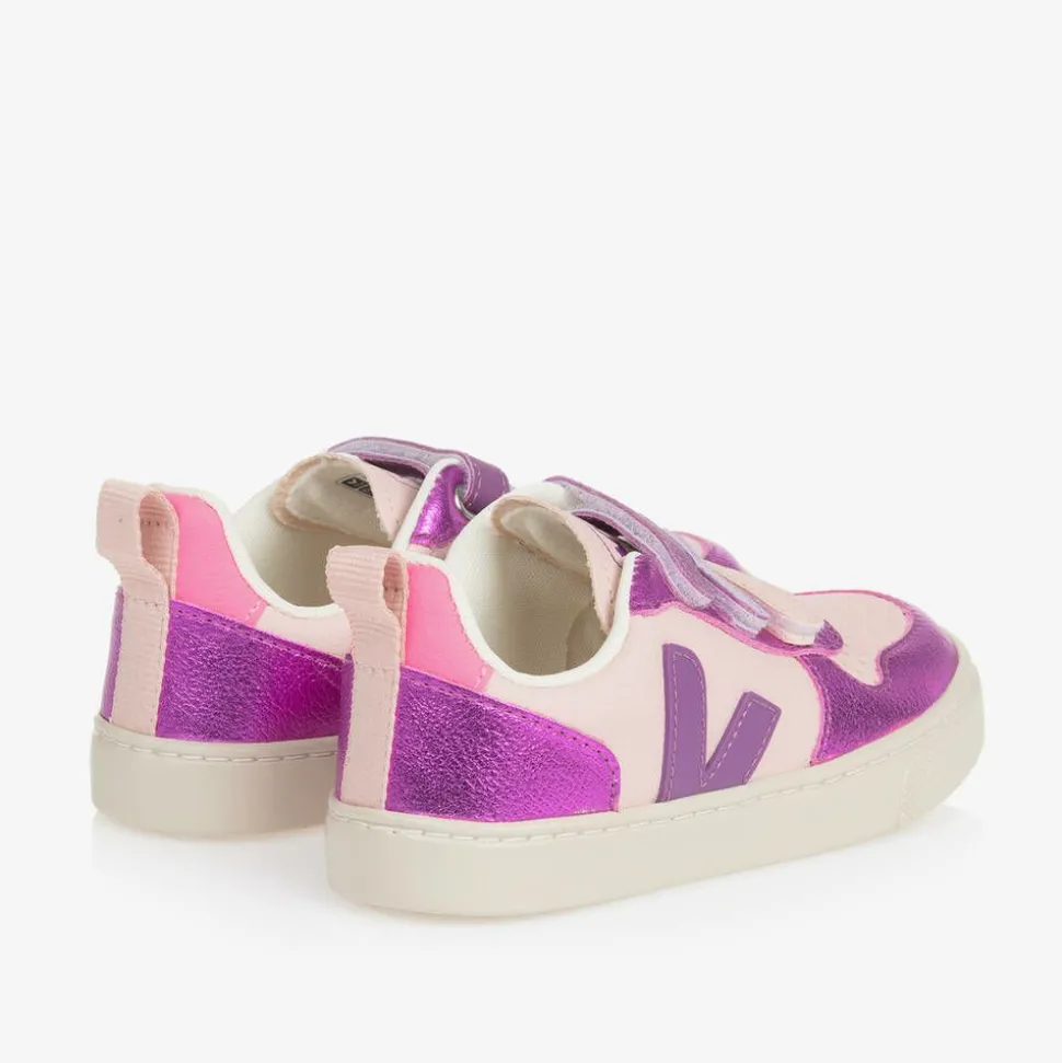 Pale pink and metallic purple trainers for girls by sustainable French brand VEJA, made in smooth ChromeFree leather. For instant brand recognition, they have the designer's iconic 'V' logo at the sides. They have practical velcro strap fastenings, a pale pink pull tab on the back of the heel, and perforated detailing on the front. There is a soft textile lining and cushioned cotton insoles for comfortable wear, with Amazonian rubber soles for good grip.