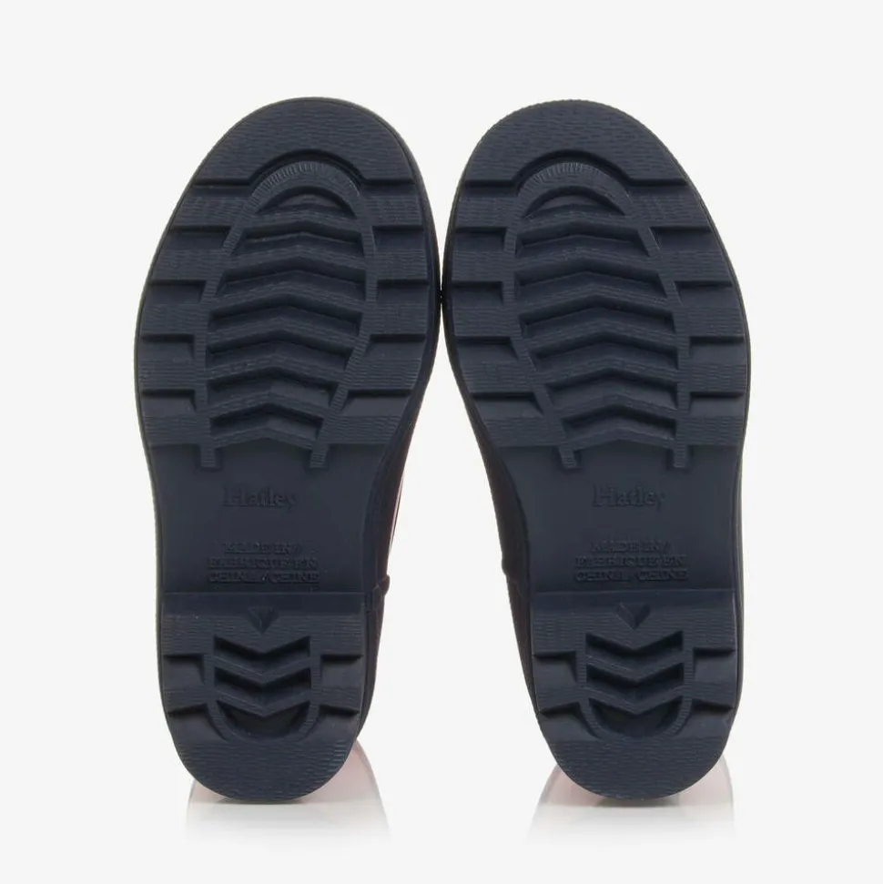 Pale pink and navy blue matte rain boots for girls by Canadian brand Hatley, made from PVC-free rubber. Lined in soft and comfortable cotton, they are designed with non-slip outer soles and removable insoles. They have a light-reflective logo patch on the front for safety and a pull-tab on the back to help make dressing simple.