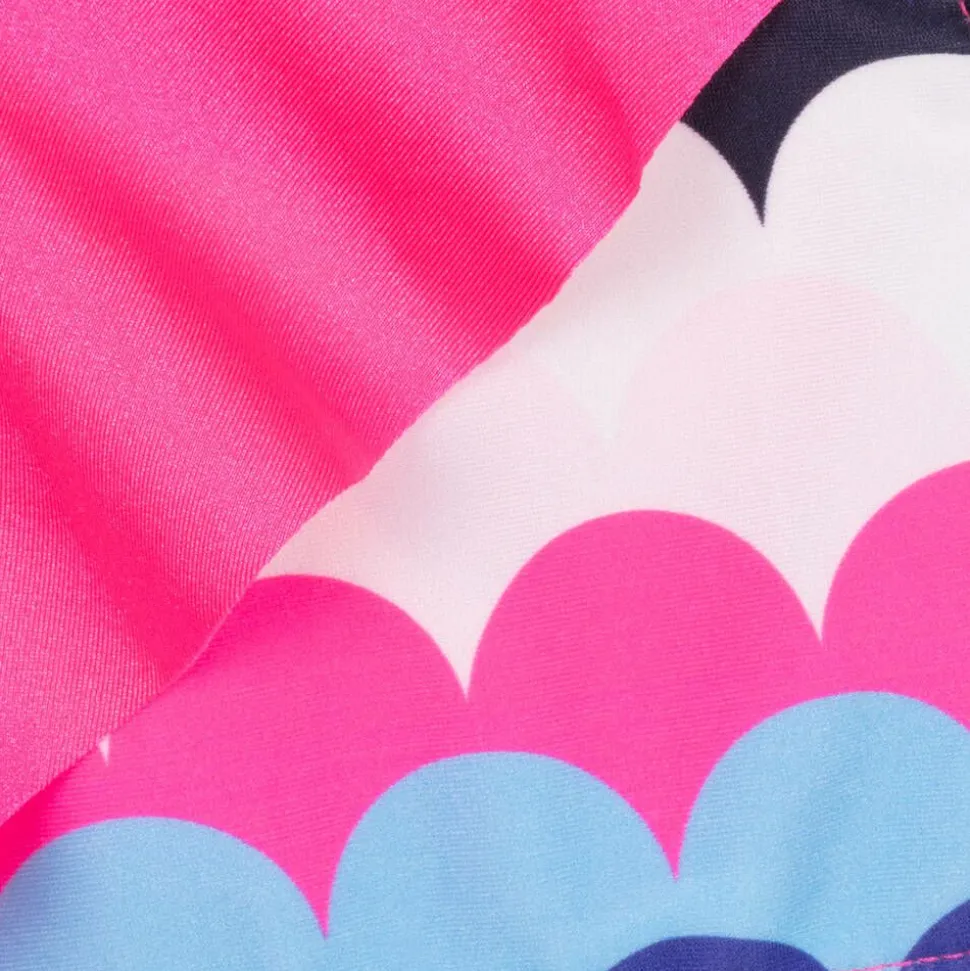 Neon pink bikini for girls by Billieblush, made in silky smooth and stretchy fabric. The one-shoulder top has a pink ruffle trim and the matching bottoms have a stretchy waistband. Both pieces are patterned with scalloped stripes in complementing shades of blue, ivory and pink.