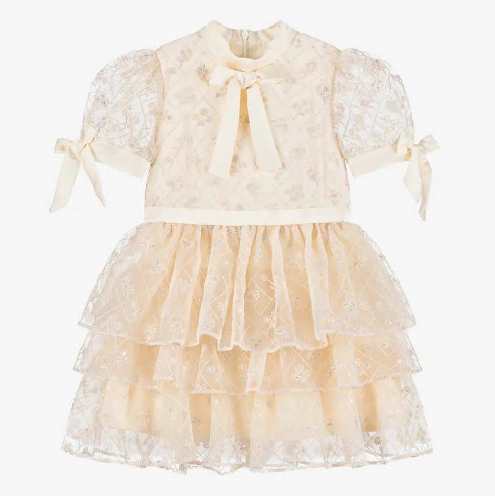 Shimmering dress for girls by EIRENE, designed with special occasions in mind. Made in sumptuous ivory satin with a pink tulle overlay, it is embroidered with a pink, blue and ivory diamond pattern, embellished in sequinned flowers that catch the light beautifully. It has a stand-up satin collar with a fixed bow below, matching the bows on the cuffs of the sheer, puffed sleeves. The tulle tiers on the skirt have layers of tulle below for extra volume and swish. Fully lined in voile for comfort, there is a concealed zip fastening on the back.