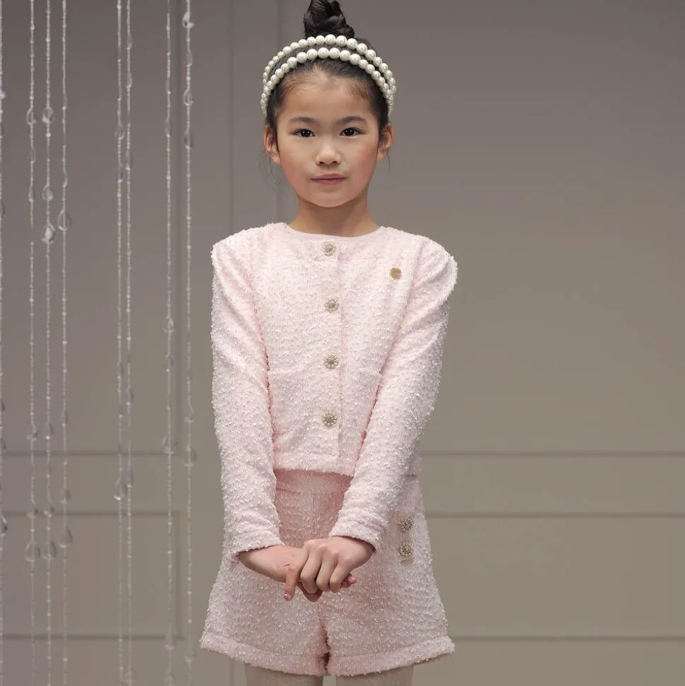Smart pink shorts for girls by Le Chic, ideal for a special occasion. Patterned with wavy, fringed lines of shiny thread and scattered sequins that catch the light beautifully, they have stylish pearl bead and diamanté faux buttons on the front. For comfort, there is a satin lining and a semi-elasticated waistband. Easy to wear, they simply pull up.