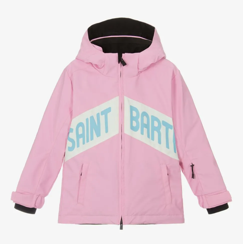Pink ski jacket for girls by MC2 Saint Barth, with bold logo branding. Made in smooth fabric with a water repellent coating, it is softly padded for warmth and has Recco reflector technology for safety. There is an elasticated snow skirt and velcro-adjustable cuffs that have stretchy internal cuffs with thumb holes to keep out chilly winds. The jacket has a handy ski pass pocket on one sleeve, taped zipped pockets, and internal toggle adjusters for an ideal fit.