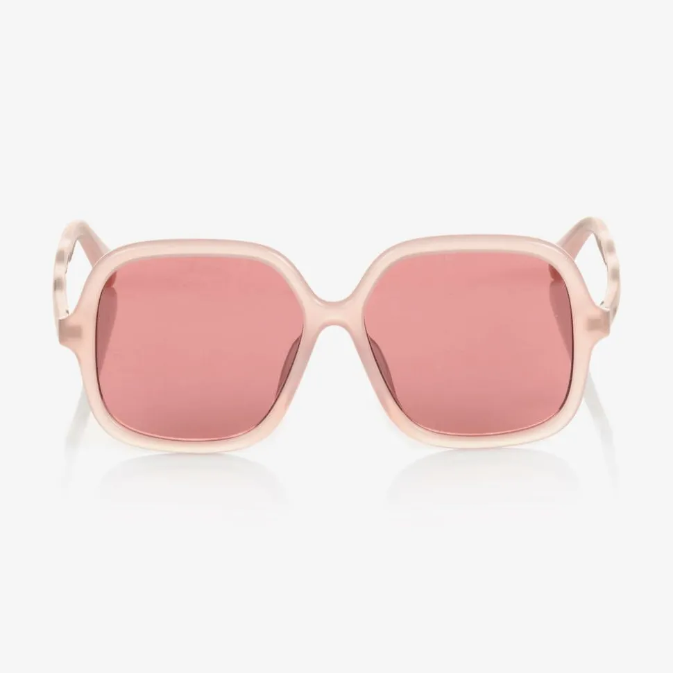 Pink Mini-me sunglasses for girls by luxury French brand, ChloƩ. Featuring stylish square shaped frames, they have tinted pink lenses with a category 2 filter, providing good protection against sun glare. They have chic wavy arms and a tiny gold logo on the left temple for a discreet designer detail. The sunglasses come in a branded protective carry case with a matching care cloth.