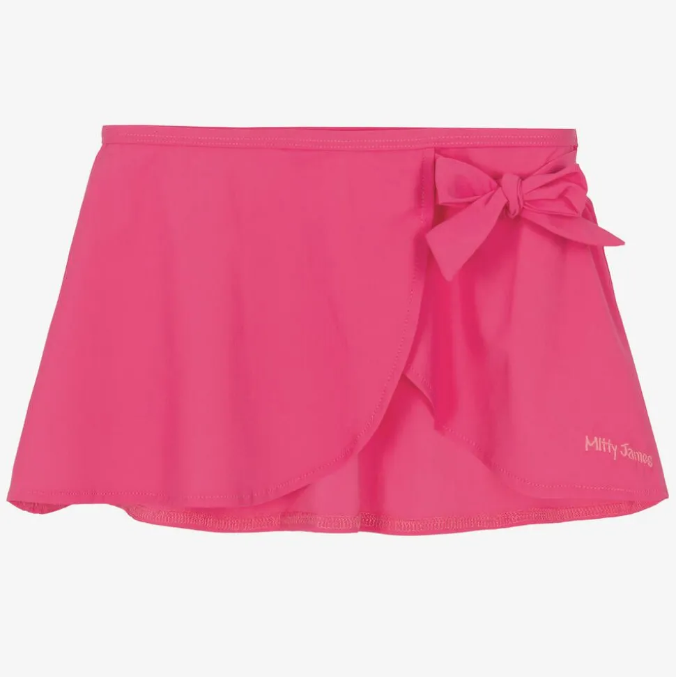 Exclusive to Childrensalon, this pink cover-up swim skirt for girls is by Mitty James, ideal for wearing over a swimming costume or bikini bottoms for additional cover at the beach or by the pool. Made in silky smooth and stretchy UPF 50+ fabric, it has a fixed bow and embroidered pink logo on one side. Easy to wear, it has an elasticated waist and simply pulls up.