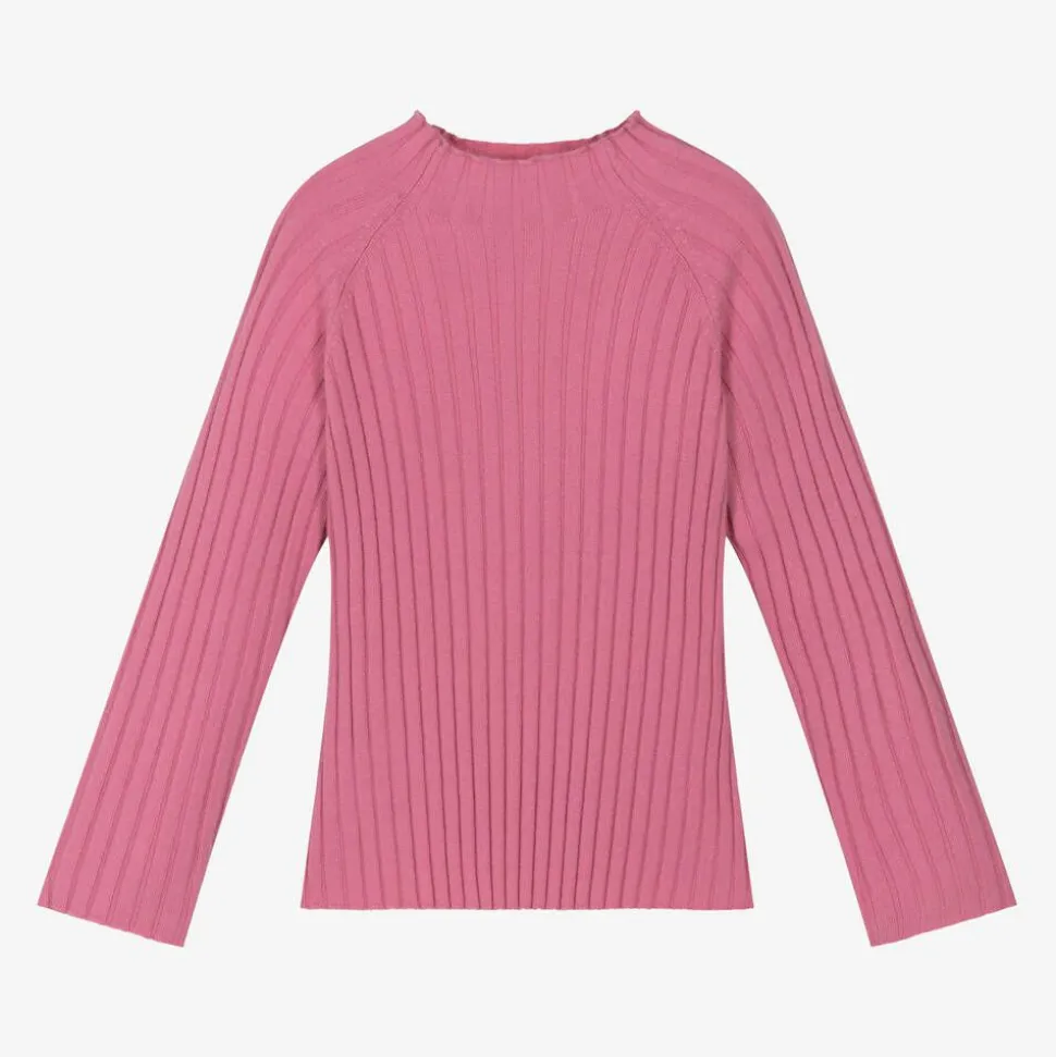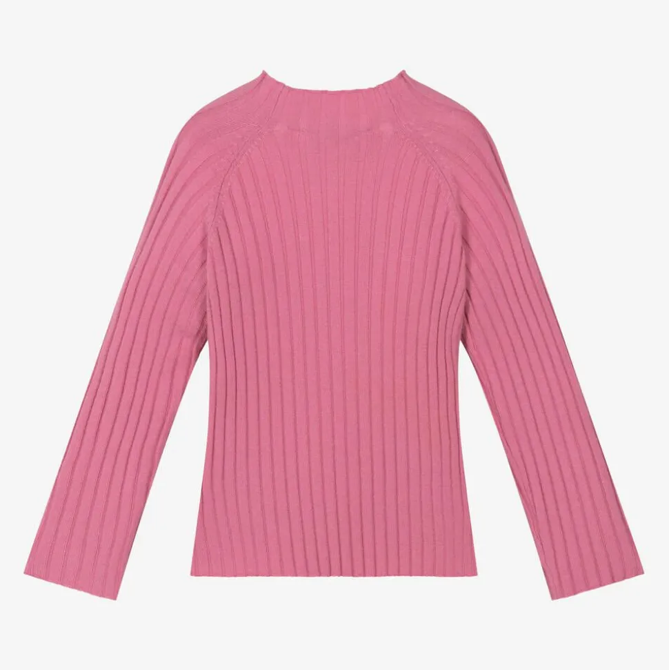 From Spanish brand Mayoral, a pink long-sleeved, turtle neck top for girls. An ideal layering piece, this wardrobe essential is made in a beautifully soft, ribbed viscose blend knit.