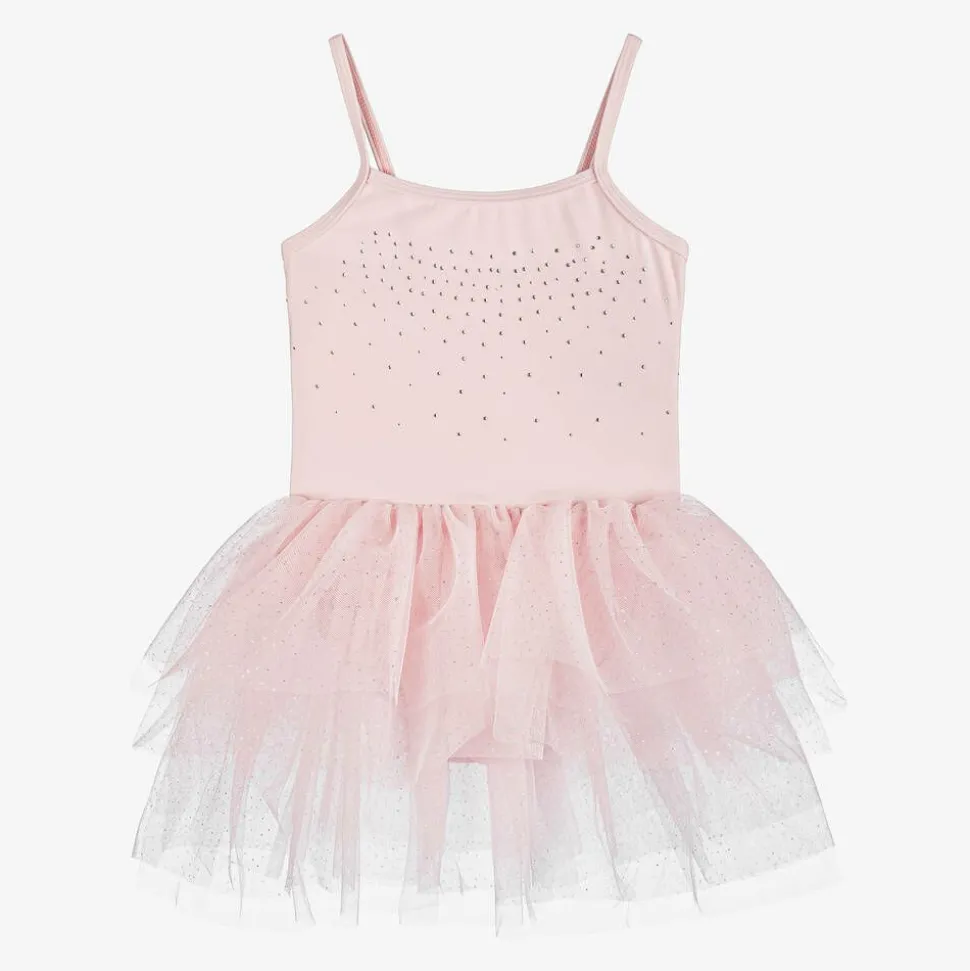 A delightful pale pink tutu dress for girls by dancewear brand, Danskin. Lovely for ballet and dance classes, the leotard is made from a super soft and stretchy fabric, allowing free and easy movement. It is designed with slim shoulder straps and has beautifully sparkly diamantés decorating the bodice. The gorgeous tutu skirt is made from tiered layers of glittery tulle for a pretty finish.