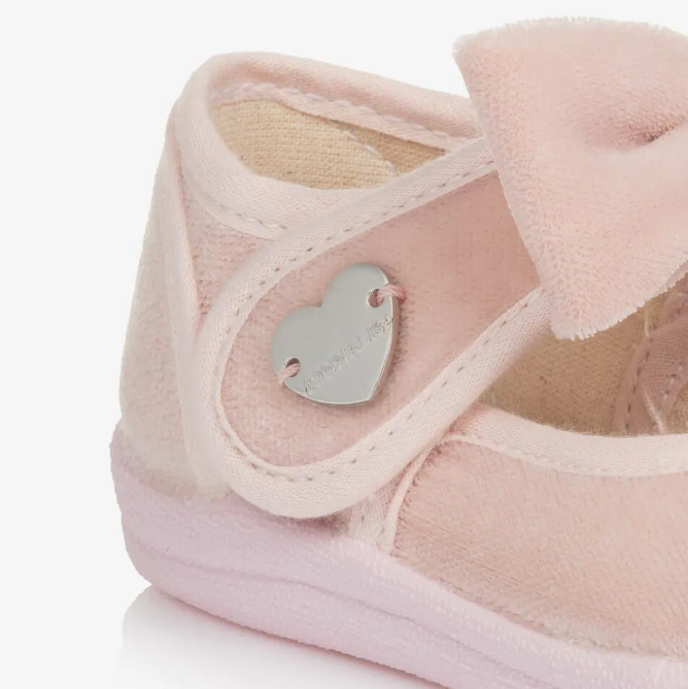 Delightful pale pink shoes for girls by Monnalisa. Made from soft velvet, they have a bow-embellished velcro strap across the front, stitched with a silver logo-engraved heart-shaped charm. Lined in a smooth weave, they have leather insoles and non-slip rubber outsoles for better grip.