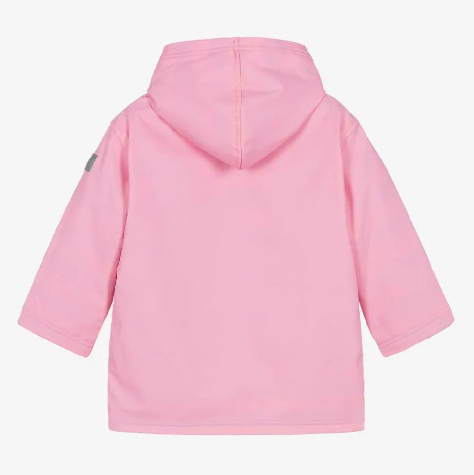 In a fun shade of pink, this waterproof raincoat for girls is by Canadian brand Hatley. The outer shell is super soft and smooth, PVC-free, and lined in comfortable towelling fabric in a white and navy blue stripe. The coat has a fixed hood and fastens smoothly with a chunky zip down the front. There are useful front pockets and reflective logo patches for added safety.