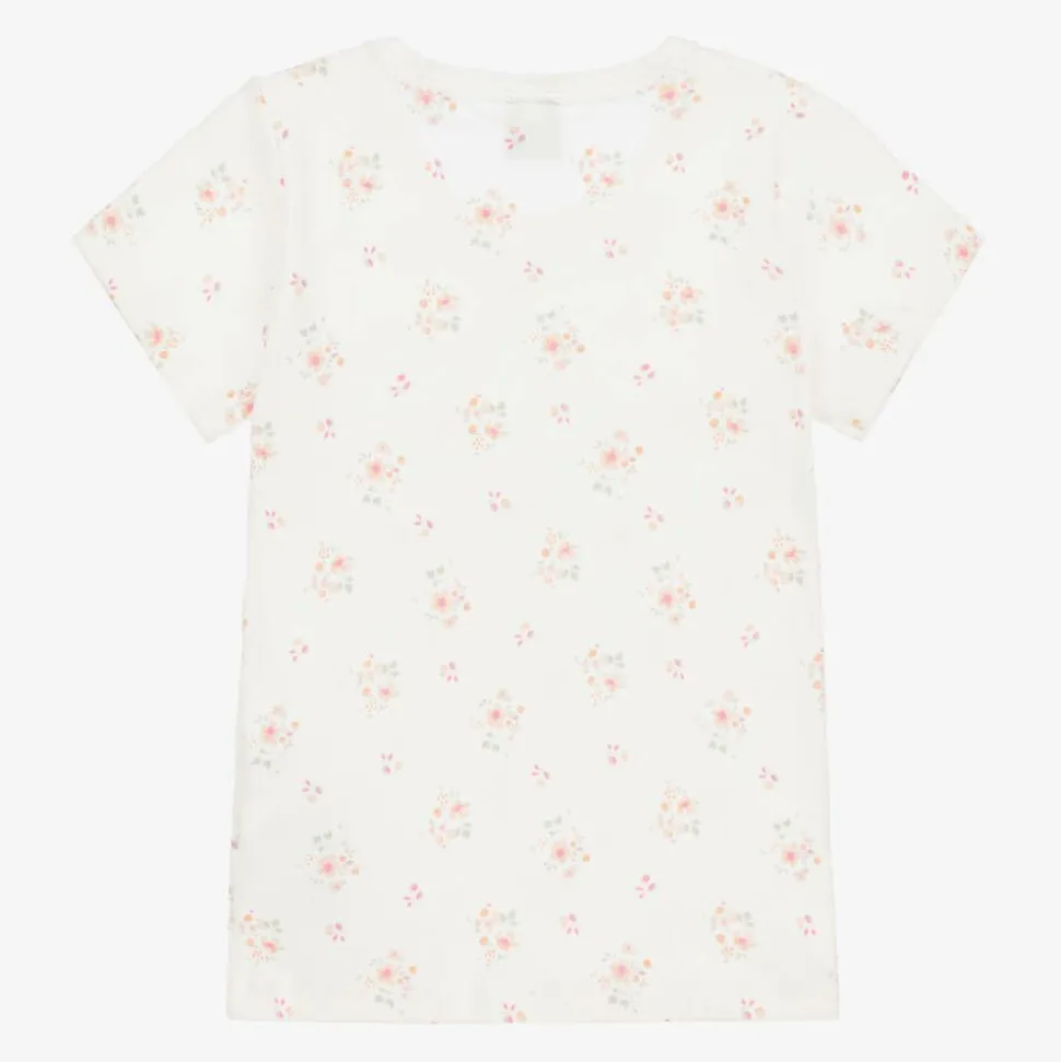 A two-pack of pale pink and white vests for girls by French brand Petit Bateau. Made in soft organic cotton jersey, each vest has short sleeves and picot embroidery around the neckline. One vest is plain pink with a delicate white bow and the other is patterned with a pretty floral print.