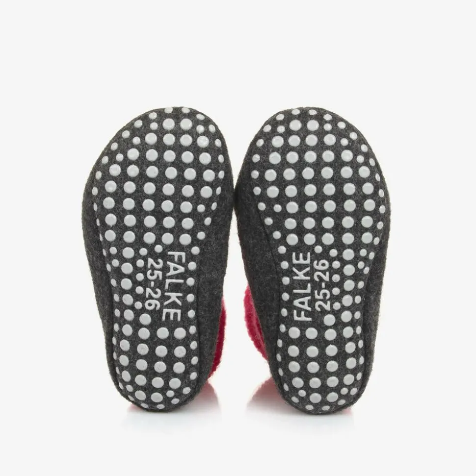 A cosy pair of pink and grey slipper socks for boys and girls by Falke, knitted in a soft Merino wool blend. Great for indoor use, these ergonomic socks have snug fold-over cuffs, and a sturdy felt sole. The soles are finished with anti-slip rubberised pads, offering improved grip on smooth surfaces.