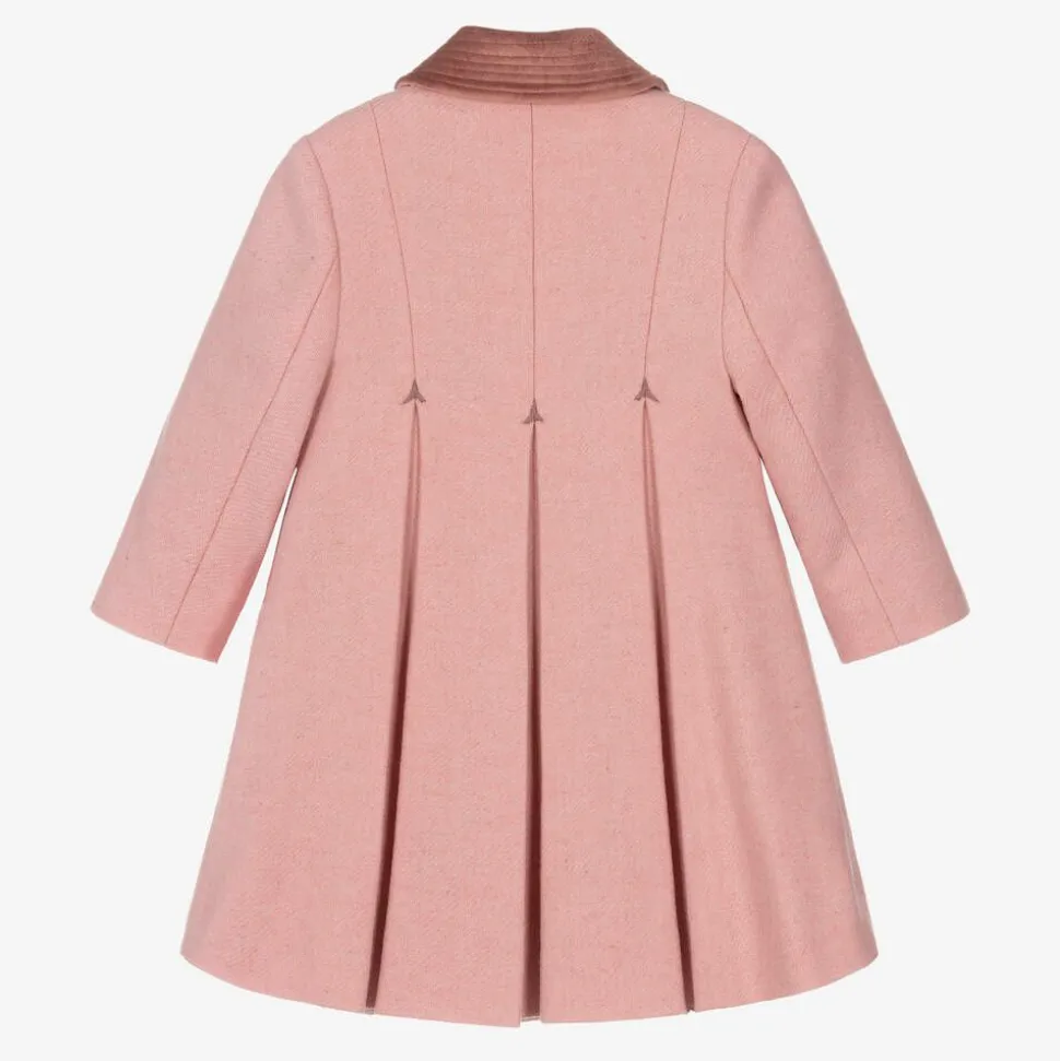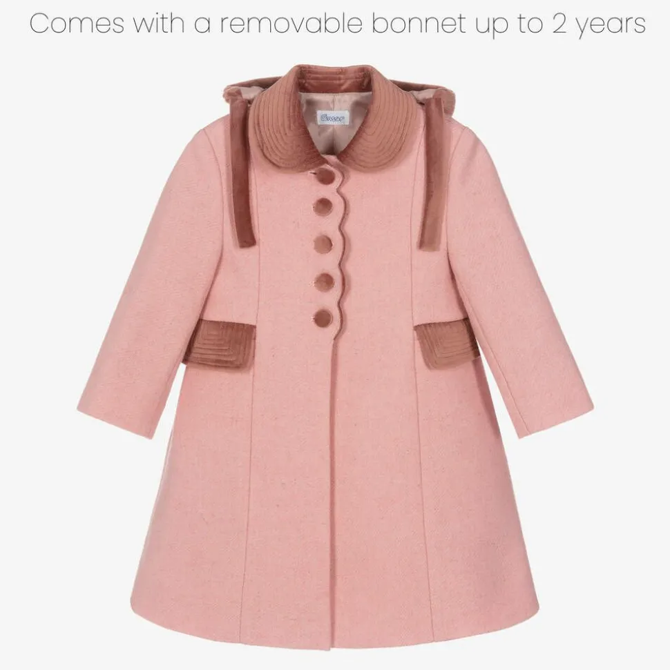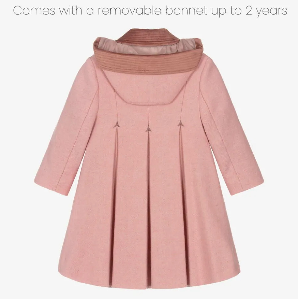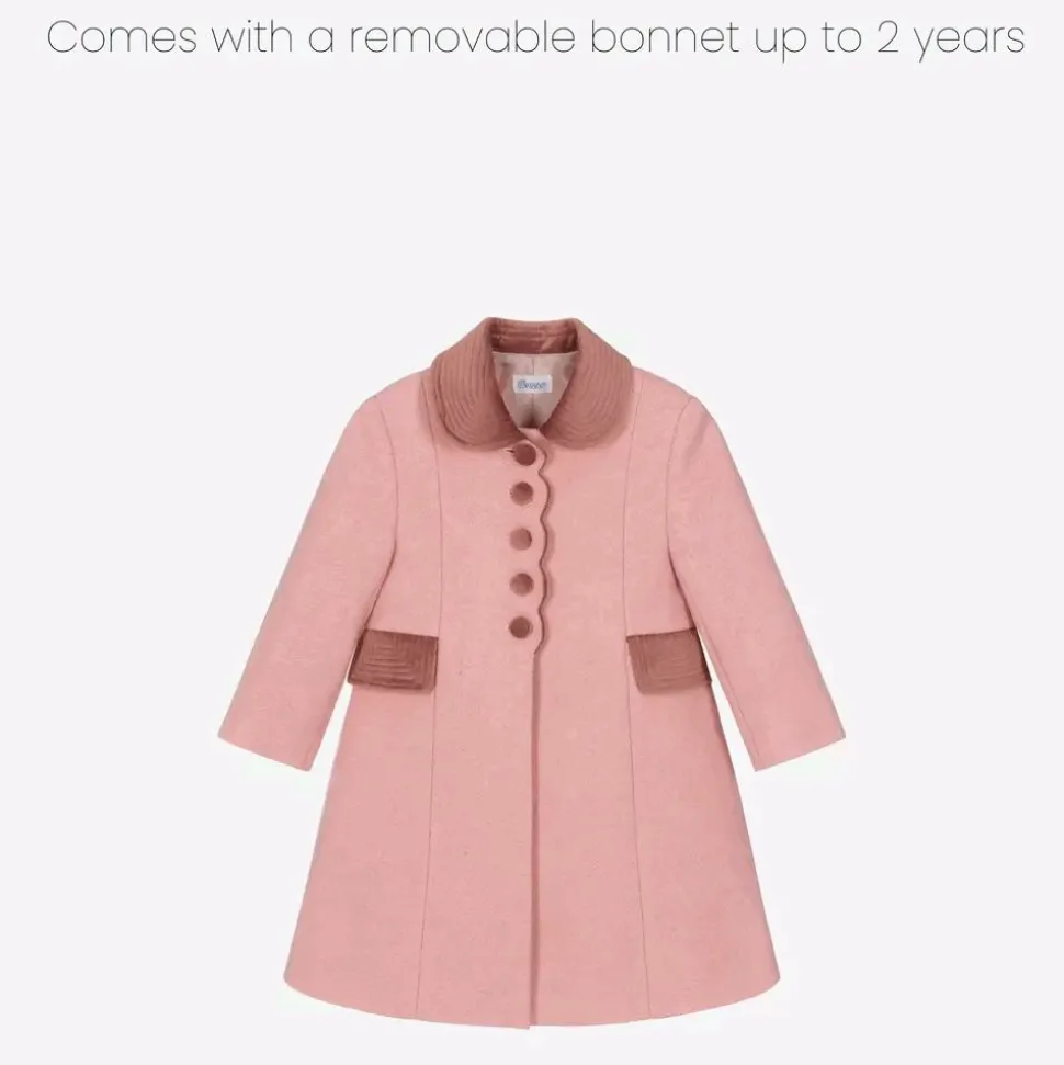 Classic pink coat for girls from Spanish brand Ancar, made in luxurious wool. For a traditional heritage look, it has a stitched velvet collar and pocket flaps, with matching covered buttons and scalloped trim. It is designed with smart inverted pleats on the back for ease of movement and has a beautiful tonal satin lining. Smaller sizes come with a matching bonnet, which neatly attaches to the coat.