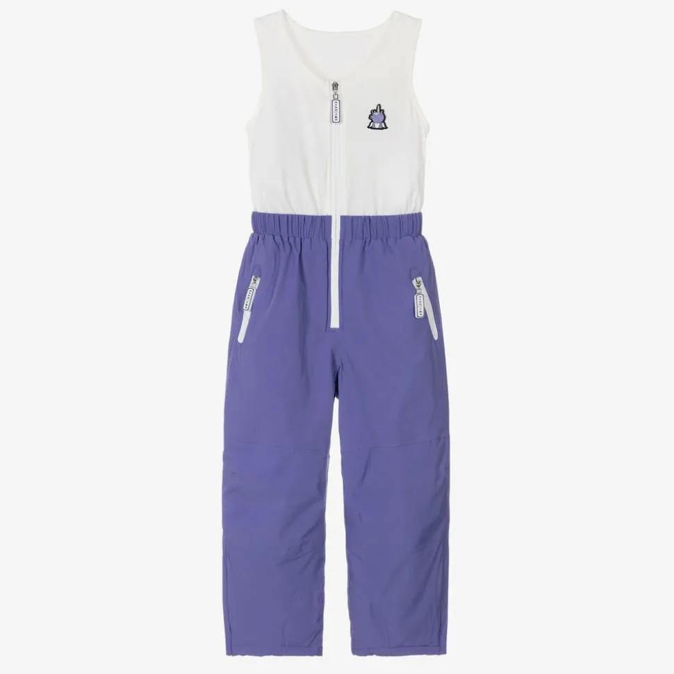 Fun unicorn-themed purple technical ski trousers for girls by outdoor brand Roarsome, with a rubberised character on the attached zip-up vest top. Totally waterproof with taped seams and aqua seal zips, these cosy thermally insulated trousers have elasticated popper-fastenings gaiters for extra protection against the snow.