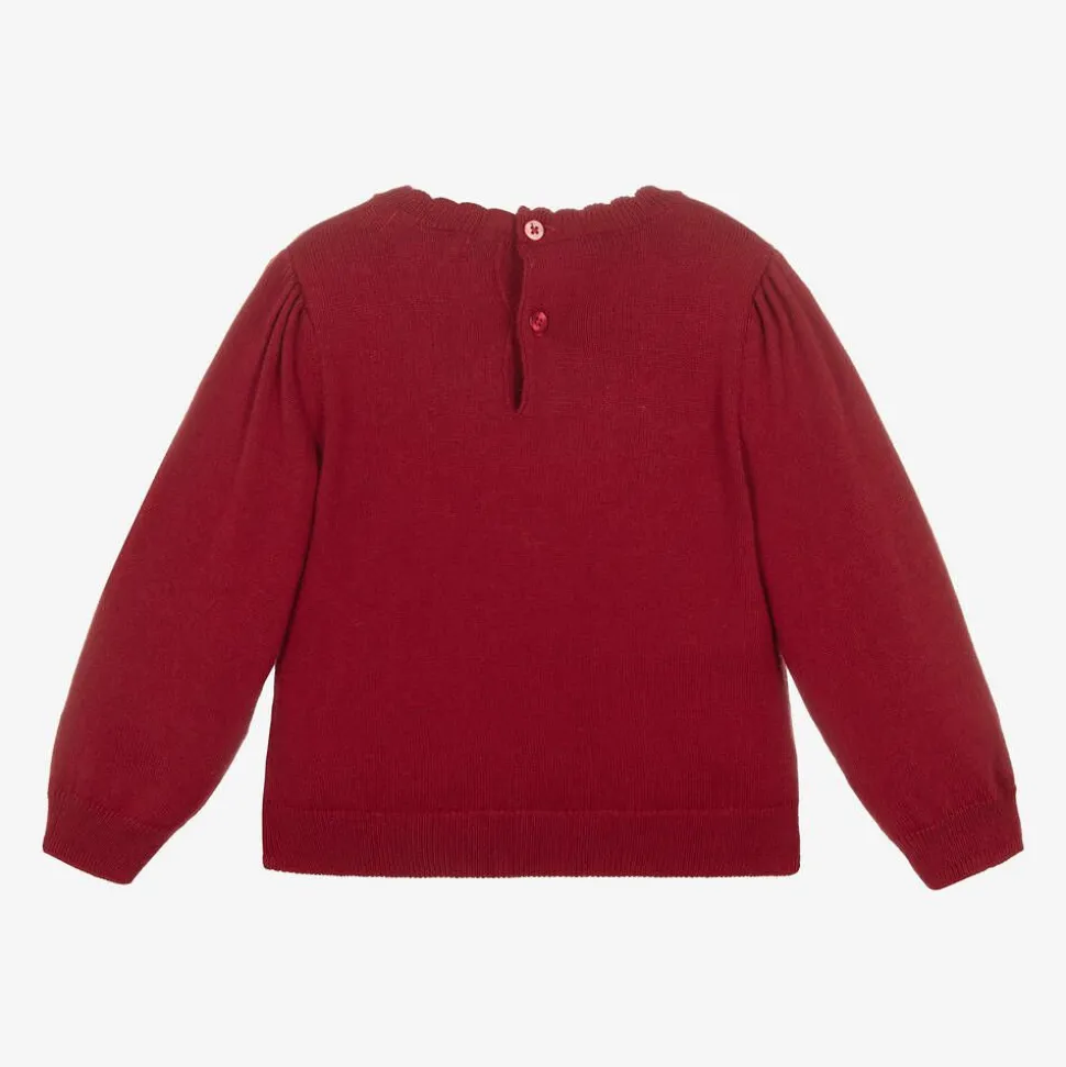 In a lovely shade of red, this jumper for little girls is by Mayoral. Knitted in a super soft cotton and wool blend, it has an adorable brown reindeer design on the front, with embroidered flowers on its antlers and beige tassel trims. Fastening neatly with buttons on the back, it has sweet scalloped edging on the round neckline, subtly puffed long sleeves, and a logo-engraved charm stitched near the hemline. This item contains recycled fibres.