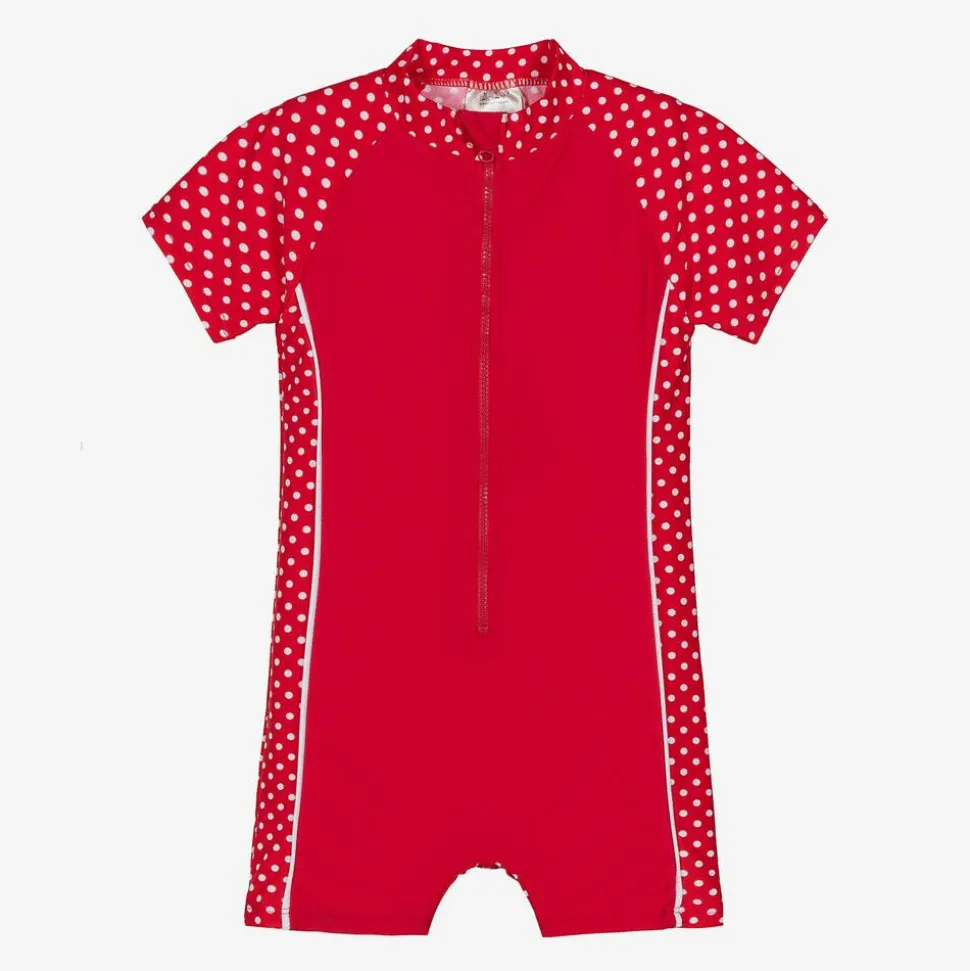 Little girls red all-in-one sun suit by Playshoes, with pretty dotted panels. With UPF 50+, this silky and stretchy one-piece fastens with a zip on the front for easy dressing, and is great to wear by the pool or on the beach.