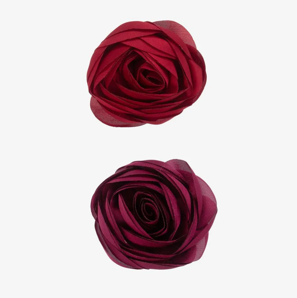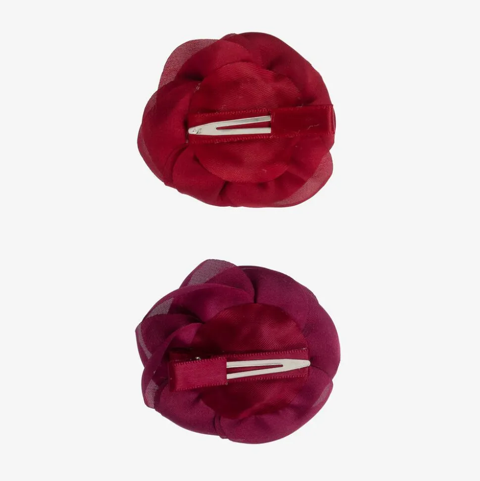 Pack of two hand made hairclips for girls by Milledeux, exclusive to Childrensalon. Designed with metallic silver, nickle-free crocodile clips, they have gorgeous chiffon roses in two shades of red.