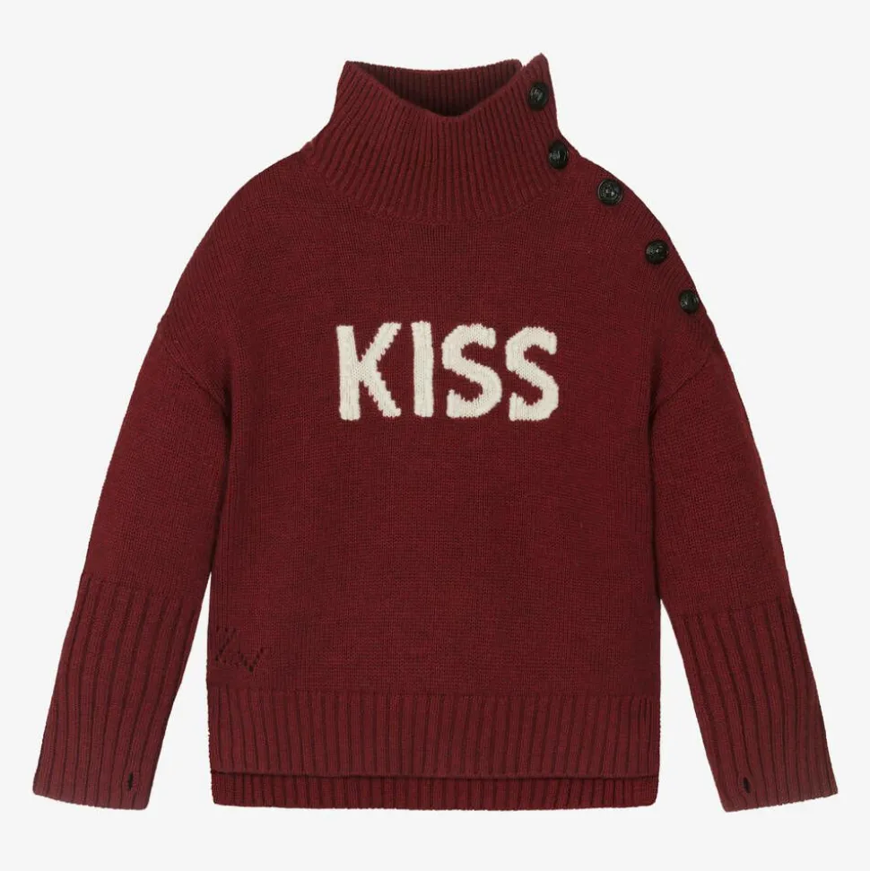 Deep red sweater for girls by Zadig&Voltaire, inspired by the adult collection. Knitted in a mid-weight wool blend, this warm layering piece features the word 'KISS' on the front and a pointelle ZV signature on the hem. Higher on the collar, it has black crest button fastenings on one shoulder and thumbholes on the cuffs. The ribbed knit hem has side vents and falls longer at the back for a more relaxed look.