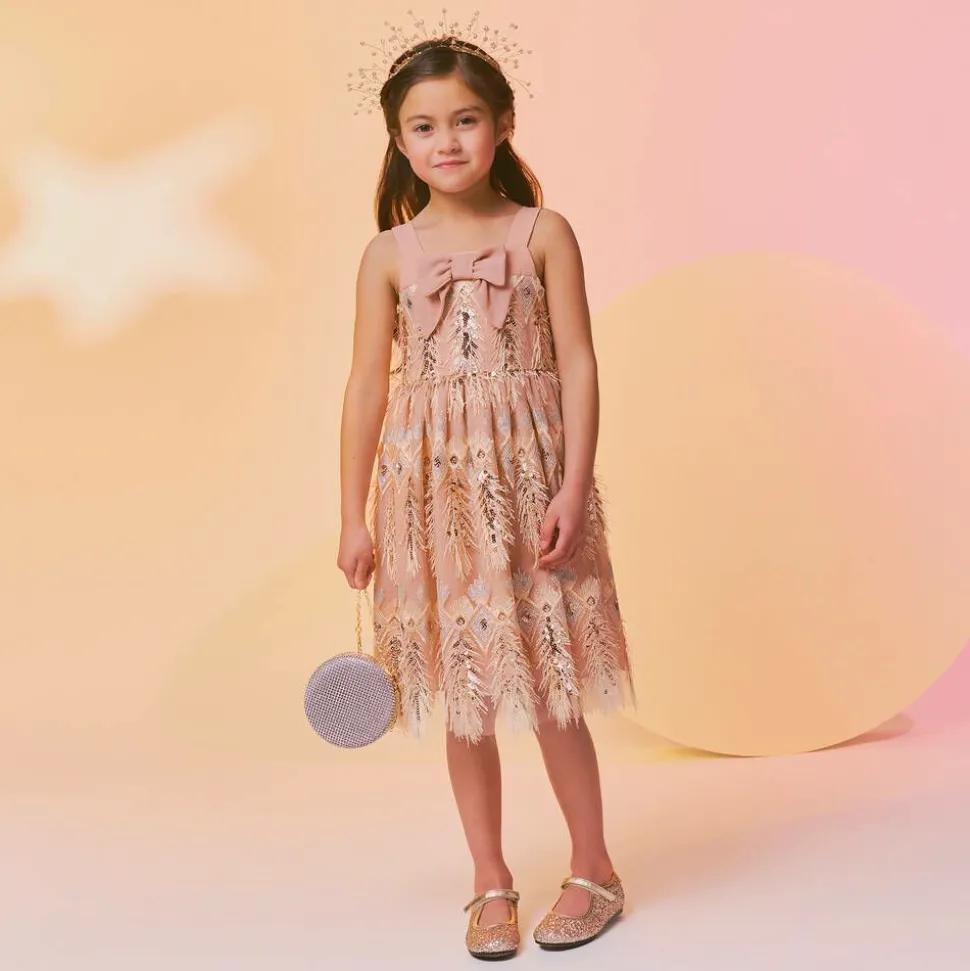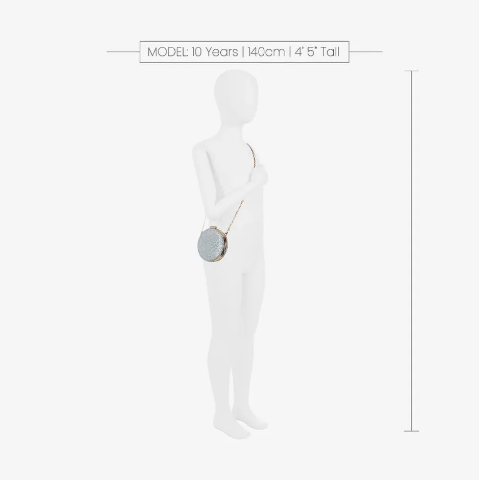 Sparkling silver round bag for girls by David Charles, encrusted with dazzling diamantés. This special occasion bag has a small, satin-lined compartment and a golden metal snap clasp fastening. A detachable, fine gold metal chain crossbody strap adds a versatile carry option to this glamorous clutch bag.