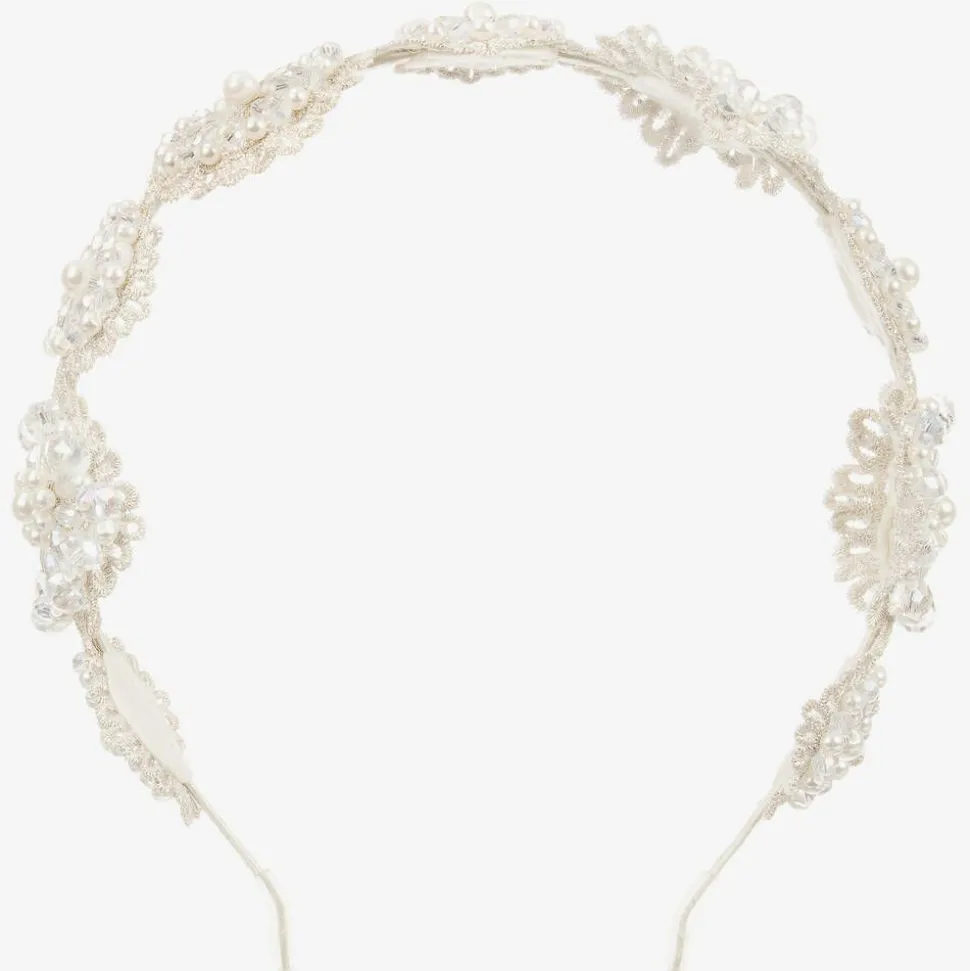 Girls handmade ivory satin covered hairband by Sienna likes to party. It has pretty silver lace flowers covered with clear and pearl beads.