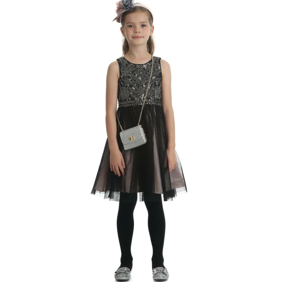 An iridescent silver shoulder bag for girls by Italian brand Zaccone, made from glitter-coated leather. Stunning and stylish, it has a gold chain strap with diamanté eyelets decorated on the top. The main compartment is lined in leather and a twist clasp fastens on the front.