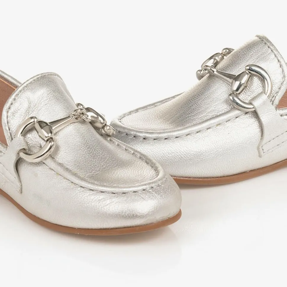 Stylish silver loafers for girls by Spanish brand Irpa, made in luxuriously soft and supple leather. The shiny silver tone horse-bit detailing adds a sophisticated look to these classic slip-ons. Great for a smart casual occasion and comfortable for everyday wear, they have a soft faux leather lining and a sleek beige sole.